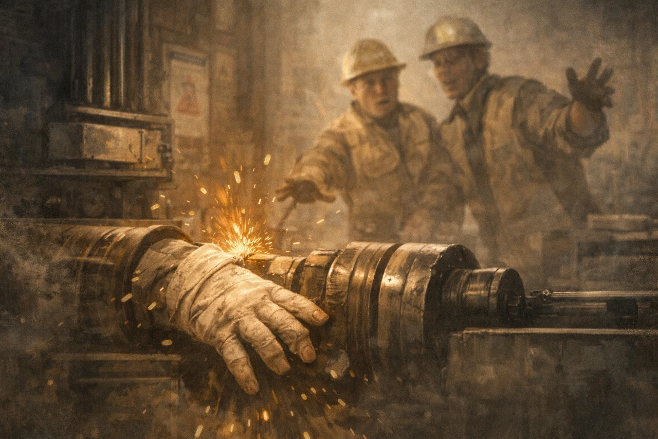 야간조 한 명이 손가락을 기계에 말려 들어갔다.