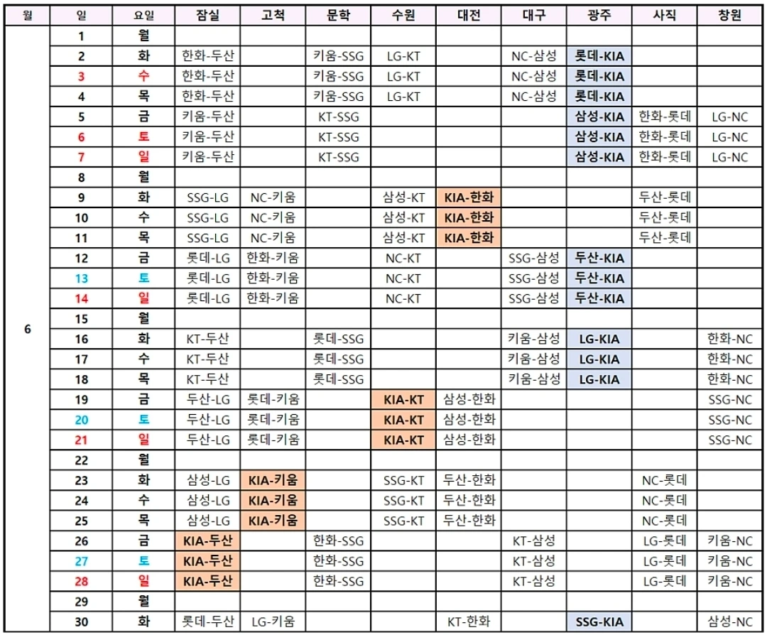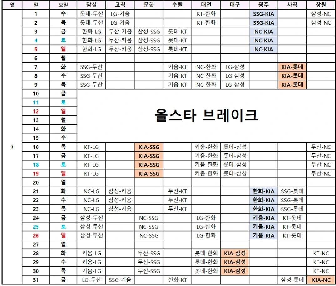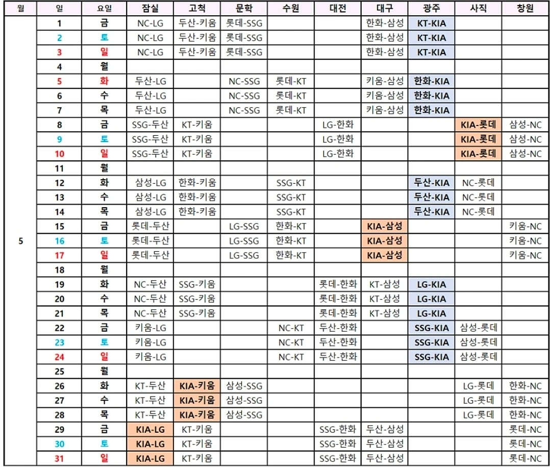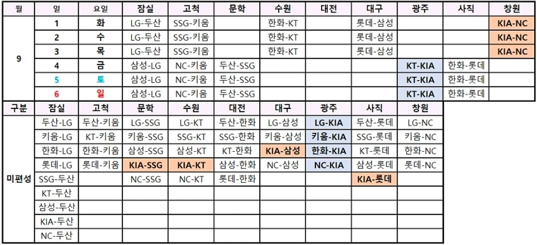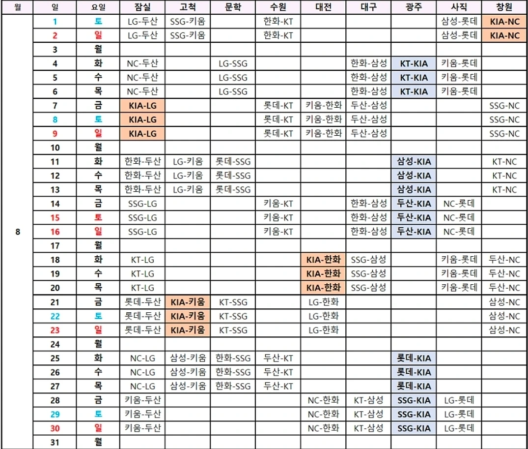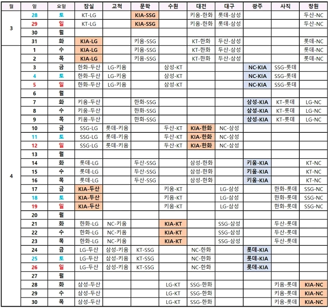 다음은 2026 정규리그 일정을 기아중심으로 정리한 계획표입니다 오렌지색은 원정, 파란색은 홈경기입니다.