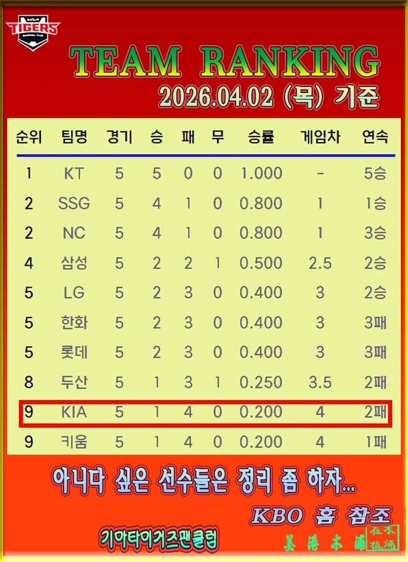 앞으로 최소 남은 4월까지는 경기를 더 지켜봐야 기아의 올해 성적을 예측해 볼 수 있을것 같다