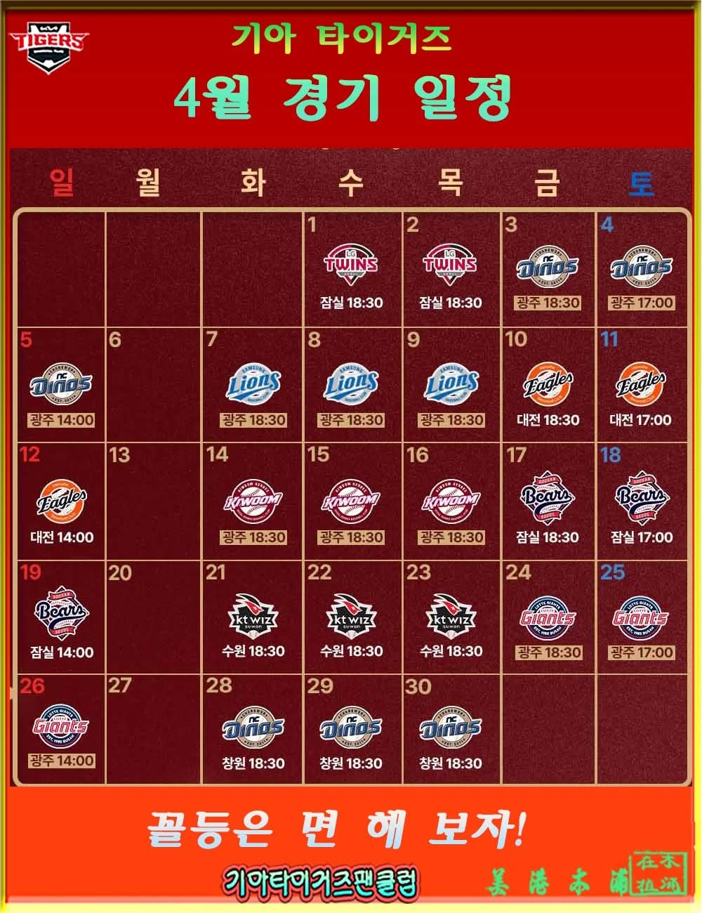 일단 기아타이거즈의 4월 경기 일정은 다음과 같습니다
