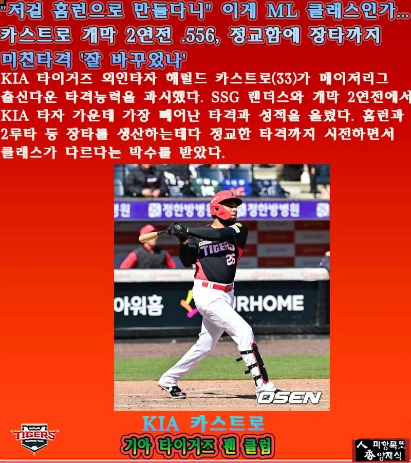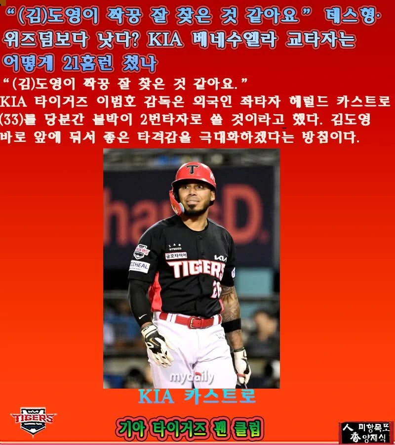 컨택능력이 좋아진 호령이 가 리드오프를 해주고 카스트로가 높은 타율로 계속 쳐대며 나가주면 뒤에 mlb수준의 우리 도영이가 버티고 있으니깐 초반에 승기를 잡기 좋다 그리고 도영이 뒤에는 나성범과 김선빈이 버티고 있다 위력적이지 않은가?
