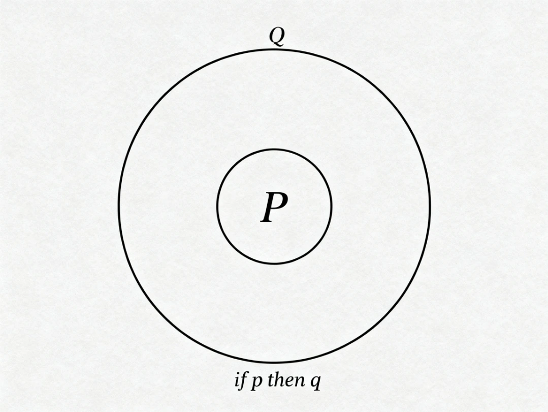 "P이면 Q"은 다음과 같은 벤다이어그램으로 개념의 포함관계를 이해할 수 있다.