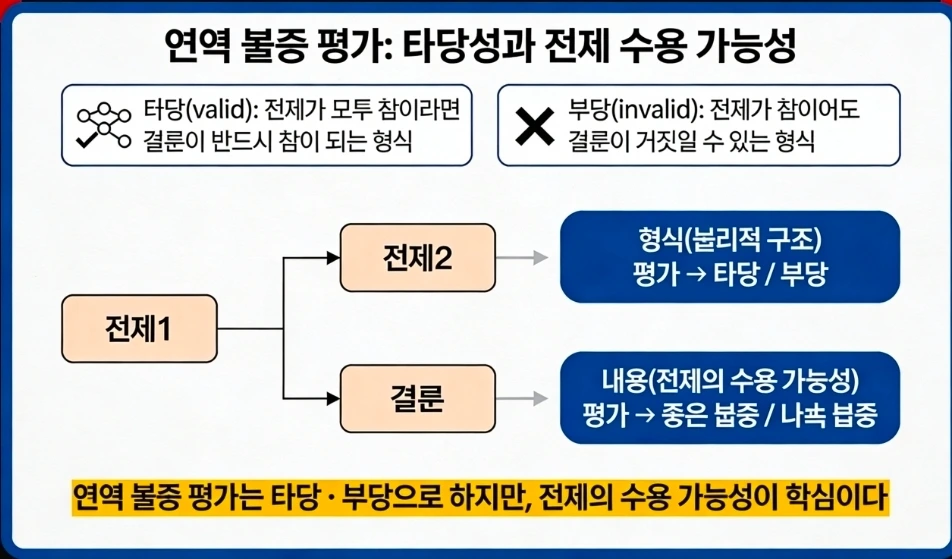 연역논증은'타당하다(valid)' 혹은 '부당하다(invalid)'라는 말로 평가한다 이건 마치 '옳다','그르다'라는 말과 같다