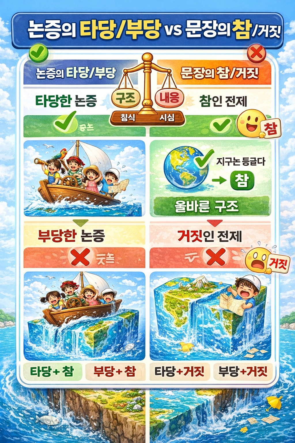 만약 지구가 네모난 모양이라면, 사람들은 배를 타고 항해하지 못할것이다 지구는 네모난 모양이다 따라서 사람들은 배를타고 항해하지 못할 것이다
