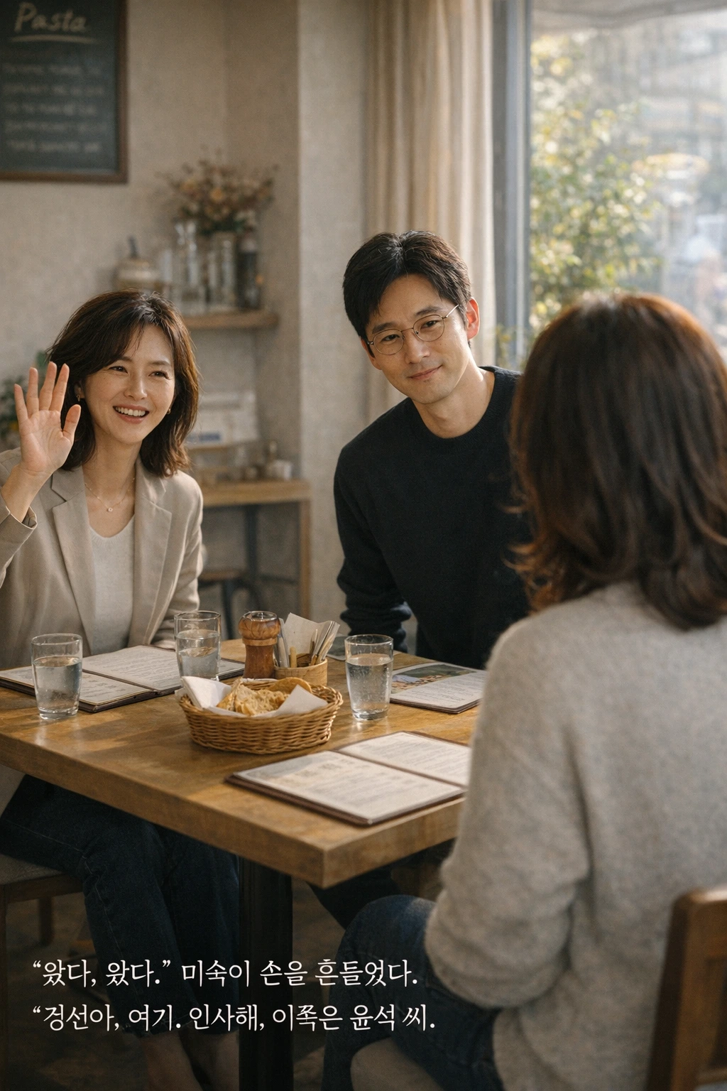 대신 시계를 한 번 보고, 창밖을 한 번 보고, 다시 남편 사진을 한 번 보았다.사진 속 남편의 웃음은, 언제나처럼 아무 말도 하지 않았다.“점심이면… 한두 시간?”“그치. 밥 한 끼 시간이면 충분하지 뭐.”정선은 그제야 아주 작게 웃었다.“알았어. 인연이 있으면 보고, 아니면 밥이나 먹고 오는 거지 뭐.”점심 약속 장소는, 미숙이 자주 가는 파스타 집이었다.정선이 도착했을 때, 미숙은 이미 창가 자리에 앉아 있었다.