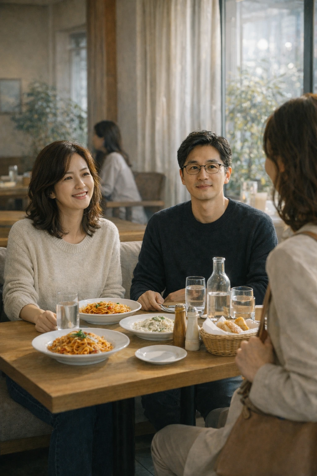 두 사람은 합을 맞추듯 리액션을 했고, 정선과 윤석은 그 사이사이에 짧게 “아, 그렇군요”를 끼워 넣었다.음식이 나오자, 한동안은 접시와 포크가 자리를 대신 채웠다.“어때, 여기 음식? 괜찮지?”“응, 맛있네.”“윤석 씨는 입에 맞아요?”“네.