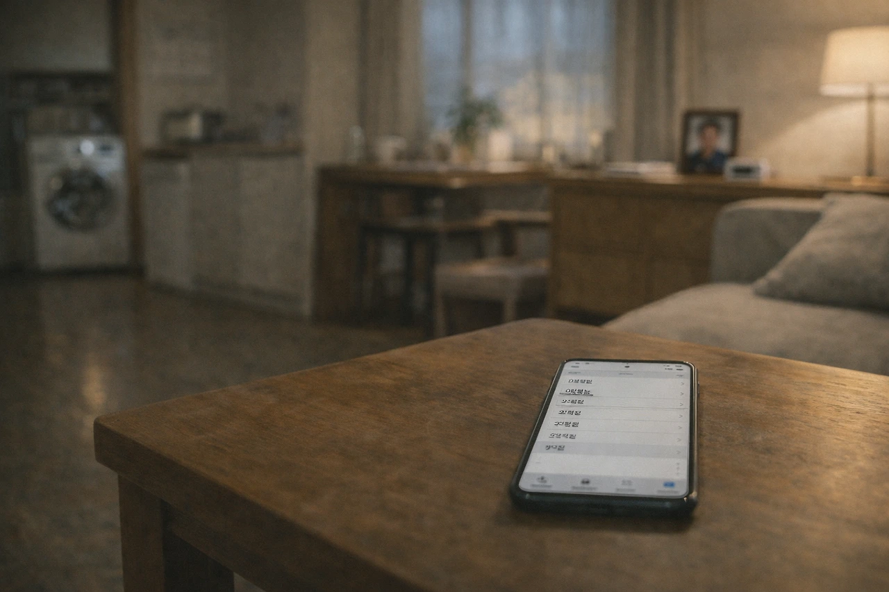 세탁기 돌아가는 소리와 냉장고의 낮은 진동음이, 아까와 똑같이 벽을 타고 흘렀다. 달라진 것이 있다면, 연락처 목록 어딘가에 이름 두 글자가 더해졌다는 것뿐이었다.