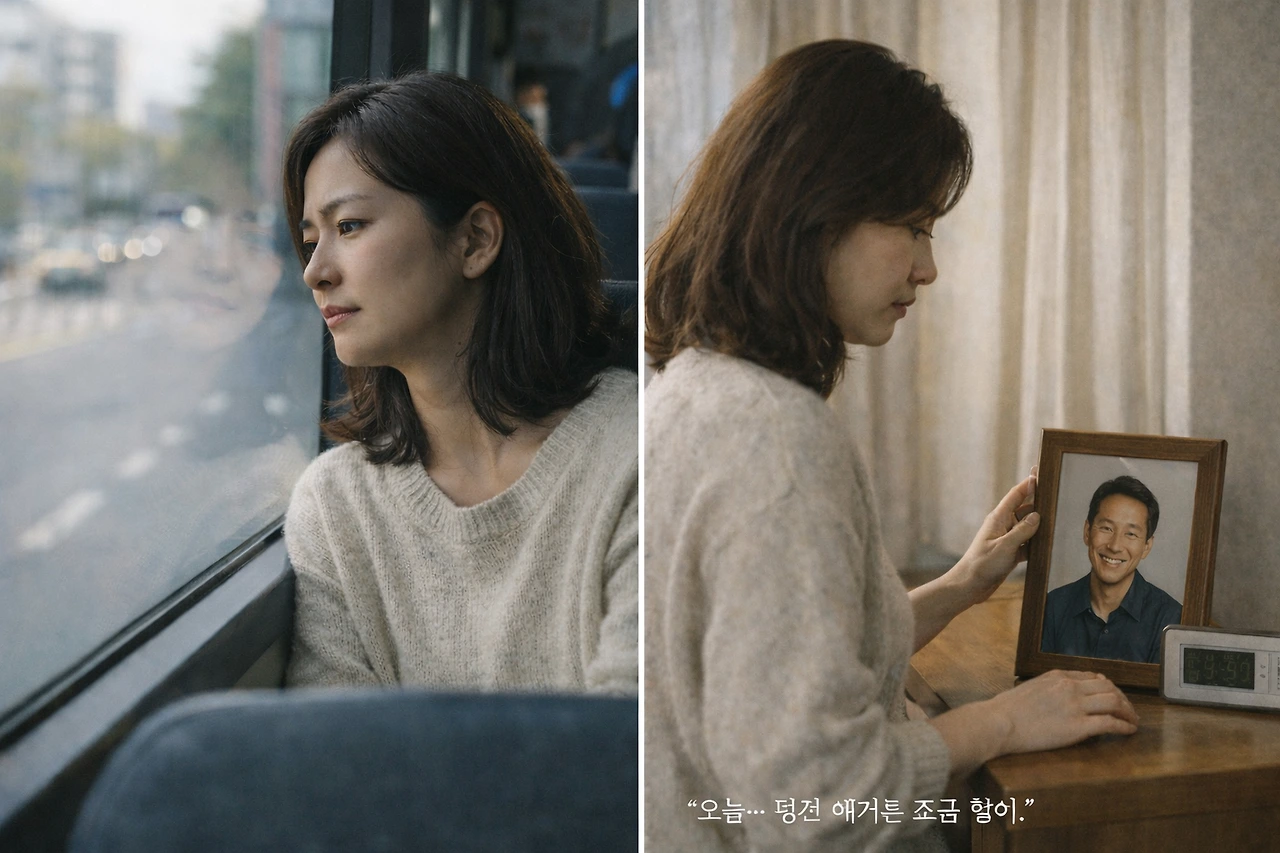 사별한 사람들끼리만 통하는 감정이 있잖아요. 말로 다 설명하지 않아도, 한두 마디만 해도 알게 되는 것들.” 정선은 천천히 고개를 끄덕였다.“그건… 저도 알아요.”둘 사이에 잠깐, 말 없는 공감이 흘렀다.“미안합니다.”