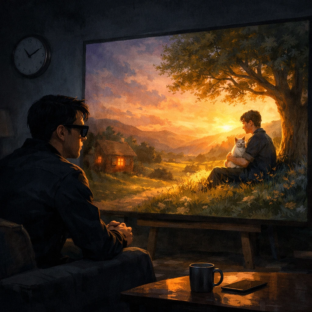 .“나도… 절반쯤은 저기에 사는 건가.”현실의 방 안, 불 꺼진 거실.