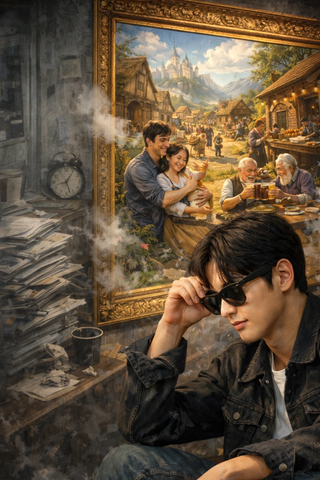 선글라스 덕분에 눈은 마주치지 않지만, 민혁은 친구가 자신이 여기에 서 있다는 사실을 알고 있다고 느꼈다.밤이 깊어갈수록 거실 공기는 차가워졌지만, 그림 속은 언제나 해질녘 빛을 머금고 있었다.