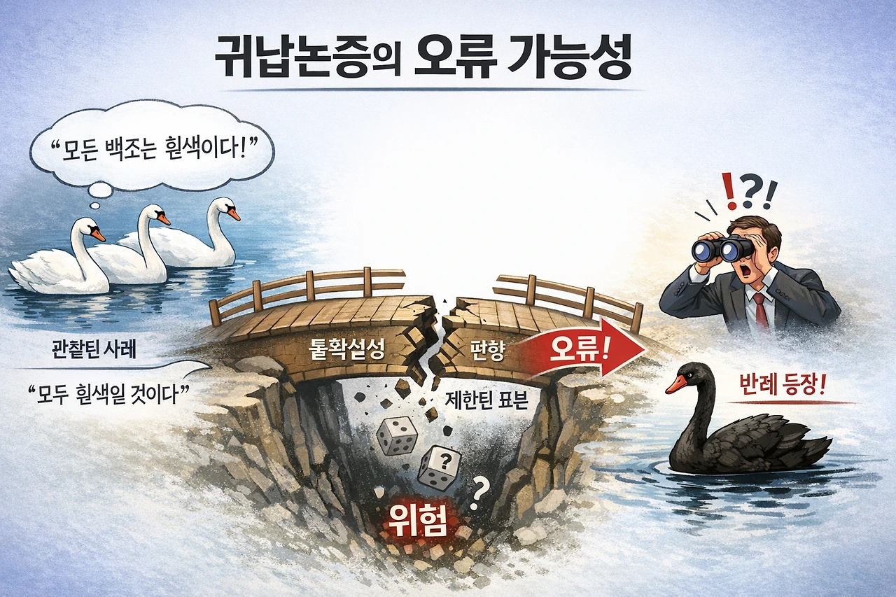 우선 이 질문에 답변하기 위해서는 다뤄야할 것이 있다 우리는 논증을 두 가지 형태로 나눈적이 있었다 전제가 참이면 결론이 필연적으로 참이 되는, 즉 전제의 참이 결론의 참을 보장하는 연역논증과 전제가 결론을 개연적으로 지지하는 귀납논증 말이다 귀납논증은 그래서 전제가 참이라고하더라도 결론의 참이 필연적으로 보장되지 않는다 다만 확률적으로 결론의 참이 개연성있게 보장될 뿐이다 그러한 귀납논증은 연역논증의 평가가 타당하다 부당하다로 딱 떨어지는데 반해서 개연적이고 확률적으로 전제가 결론을 뒷받침하는 구조이다 보니 지지하는 정도가 강하냐 약하냐로 논증이 좋은 논증과 나쁜 논증으로 평가되게 마련이고, 그래서 오류론(오류가능성에 빠질 위험)이 나오게 되었다
