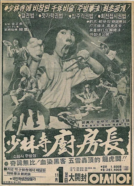 소림사 주방장은 괴짜사부를 만나 갈수록 강해졌으며, 피 묻은 침을 뱉어 거울갑옷을 입은 악당을 물리쳤다. 흑백 텔레비전에서는 느낄 수 없는 재미와 쾌감이었다.
