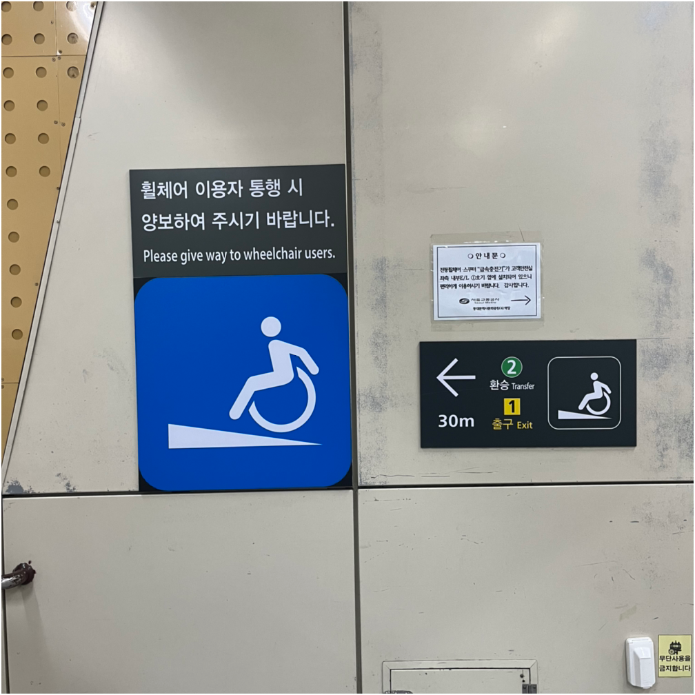 그런가 하면 한국 지하철역에서는 부끄러워서 혼났다. 작년에 나는 작문 스터디를 하기 위해 매주 신촌에 출근 도장을 찍었다. 동대문역사공원역에서 2호선으로 환승하는 구간에는 계단 옆에 비스듬한 경사로가 따로 있다. 부족한 내 다리 근육으로도 무리 없이 소화할 수 있는 통로여서 애용하곤 했다.