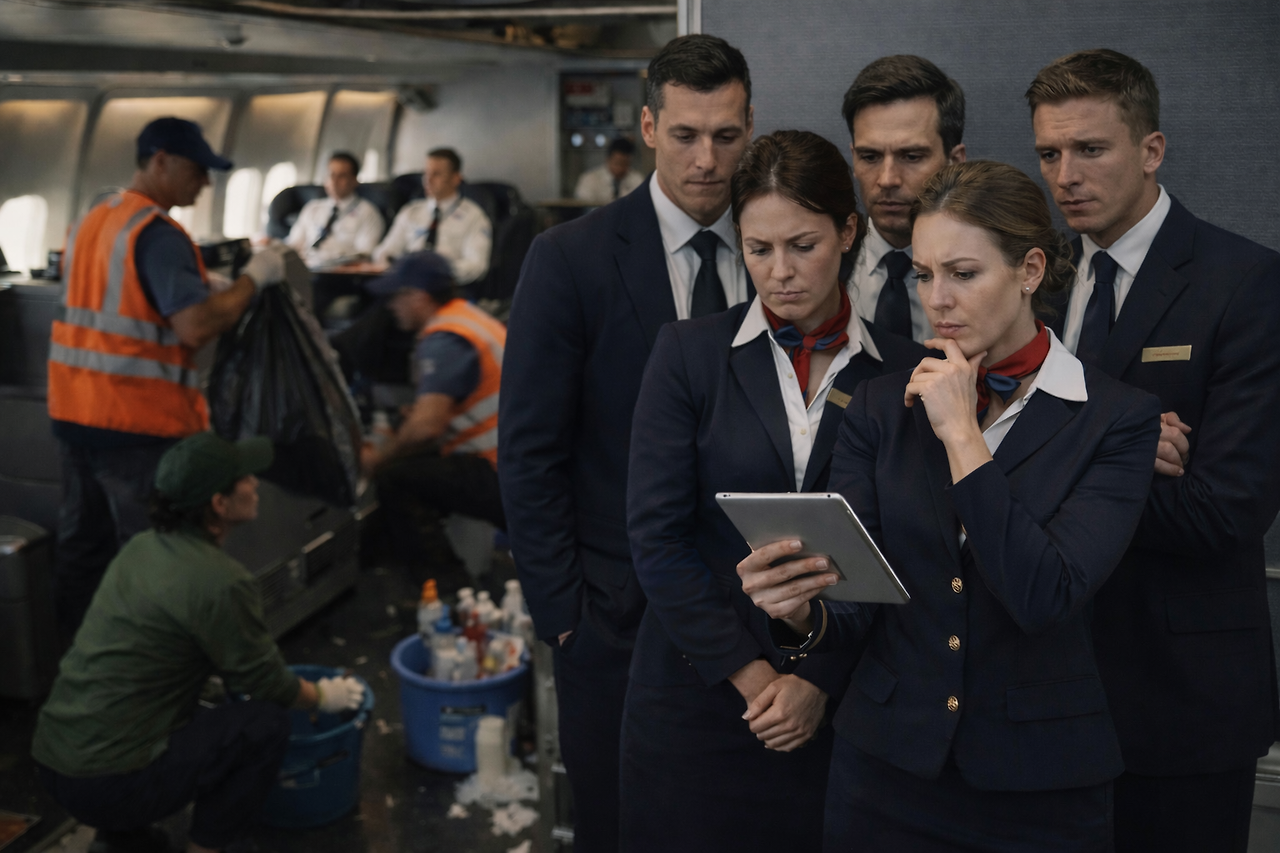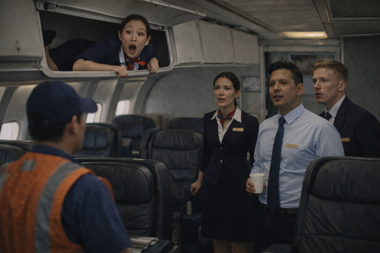 오버헤드 빈에서 내려가려던 승무원 하나는