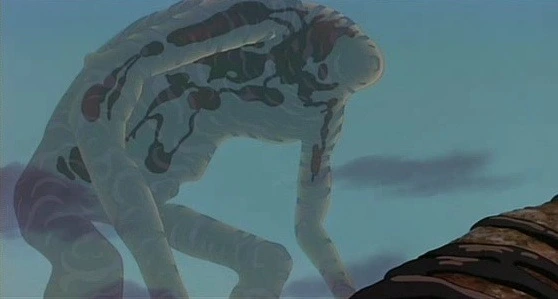 이 영화에서 사슴 신은 절대자 그 자체이다. 총에 맞은 죽음 직전의 아시타카를 살려주고, 그가 데려온 타타라 마을의 부상자들까지 회복시켜준다. 숲의 모든 원령들을 보살펴주고, 인간들에게 신이라고 불리는 숲의 고대 동물들도 함부로 할 수 없는 그의 목을 따겠다? 나는 에보시와 사냥꾼들의 목표가 가소롭게 느껴지기까지 했다. 그런데 정말 그 일이 실제로 일어났다. 조정의 명령을 받은 밀정과 사냥꾼들은 기어이 사슴 신의 목을 얻는 데 성공하고야 만다. 그런데 그 이후의 상황은 아포칼립스 그 자체이다. 사슴 신의 발걸음마다 생명이 태어나고 죽는 그의 능력은, 그의 목이 날아가자마자 죽음 그 자체로 변모한다. 정체를 알 수 없는 액체가 사방으로 뻗어나가서 인간을 비롯한 숲의 모든 생명체들을 없애버리기 시작한 것이다.