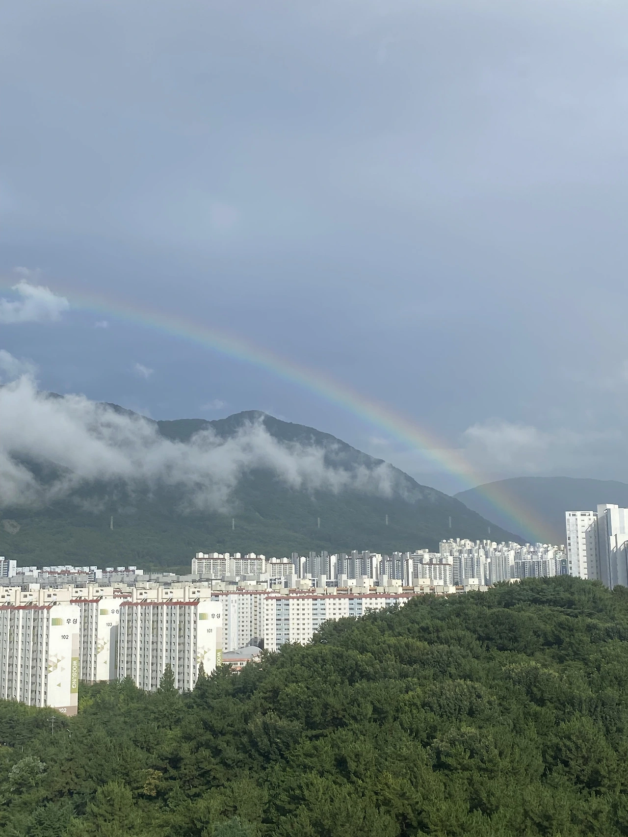 문득 고개를 돌려 동쪽 하늘을 올려다보았는데 아닌 게 아니라 동화처럼 아파트 단지 위로 무지개가 선명하게 비치고 있었다.