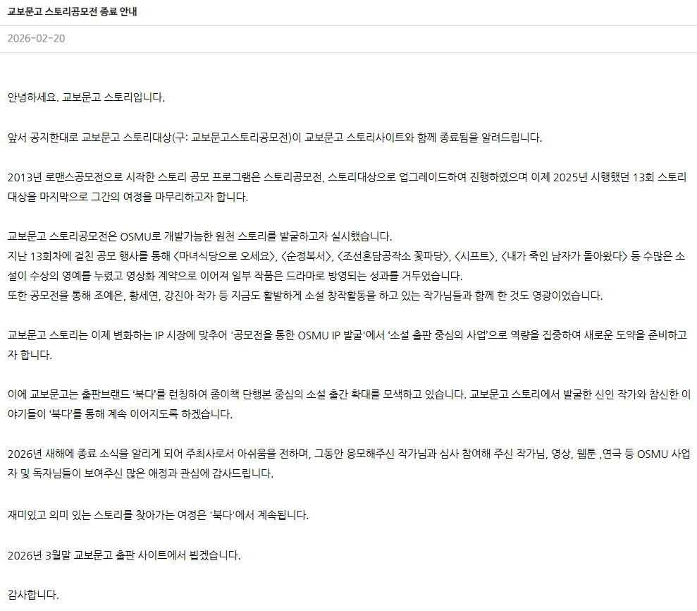 최근 교보문고 창작의 날씨에 이어 교보문고 스토리 사이트와 공모전도 문을 닫게 되었습니다.