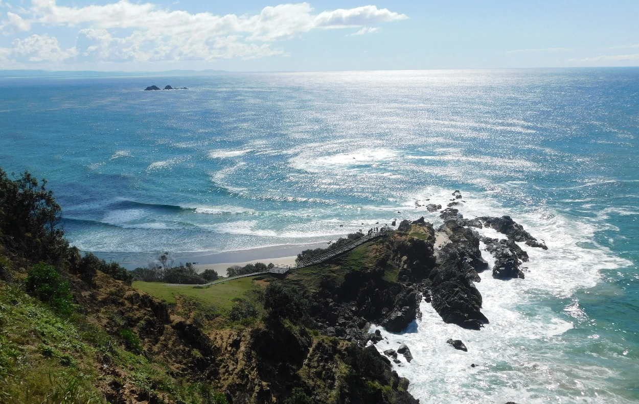 조금 걸어 내려가니 전망대가 있다. 호주 대륙에서 가장 동쪽에 위치한 장소라는 설명이 붙어있다. 일출을 호주 대륙에서 제일 먼저 볼 수 있는 곳이다. 호주에서 가장 동쪽에 위치한 전망대 아래에서는 돌고래들이 물속을 오르내리며 숨바꼭질하고 있다.