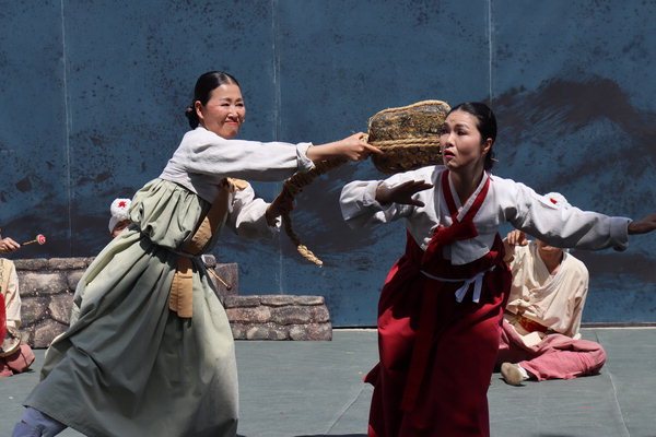극단 큰들 <최참판댁 경사났네> 200회 공연 한 장면. 김혜경(왼쪽) 배우가 메주를 휘두르고 있다.