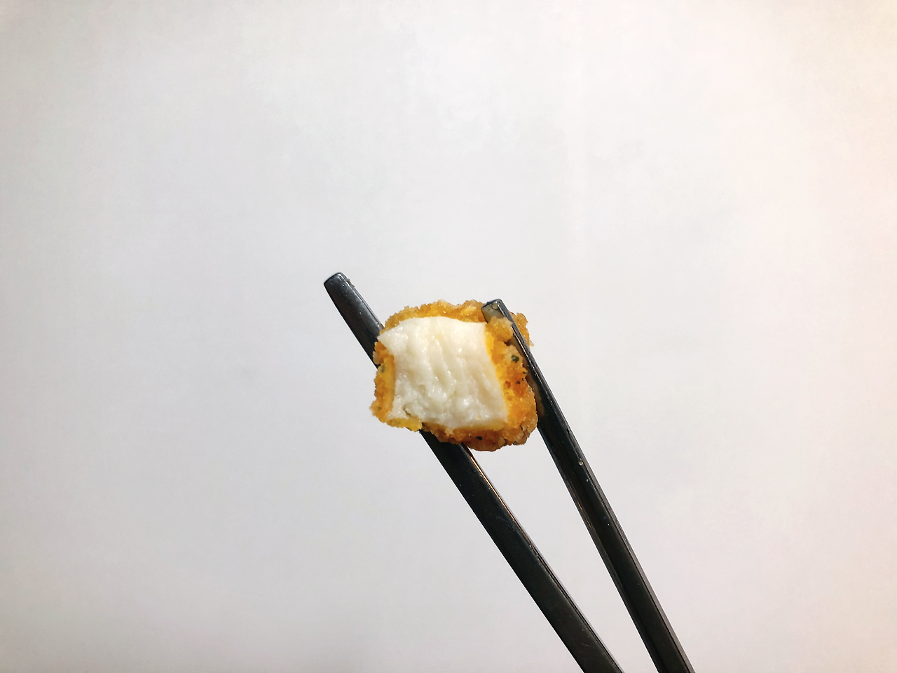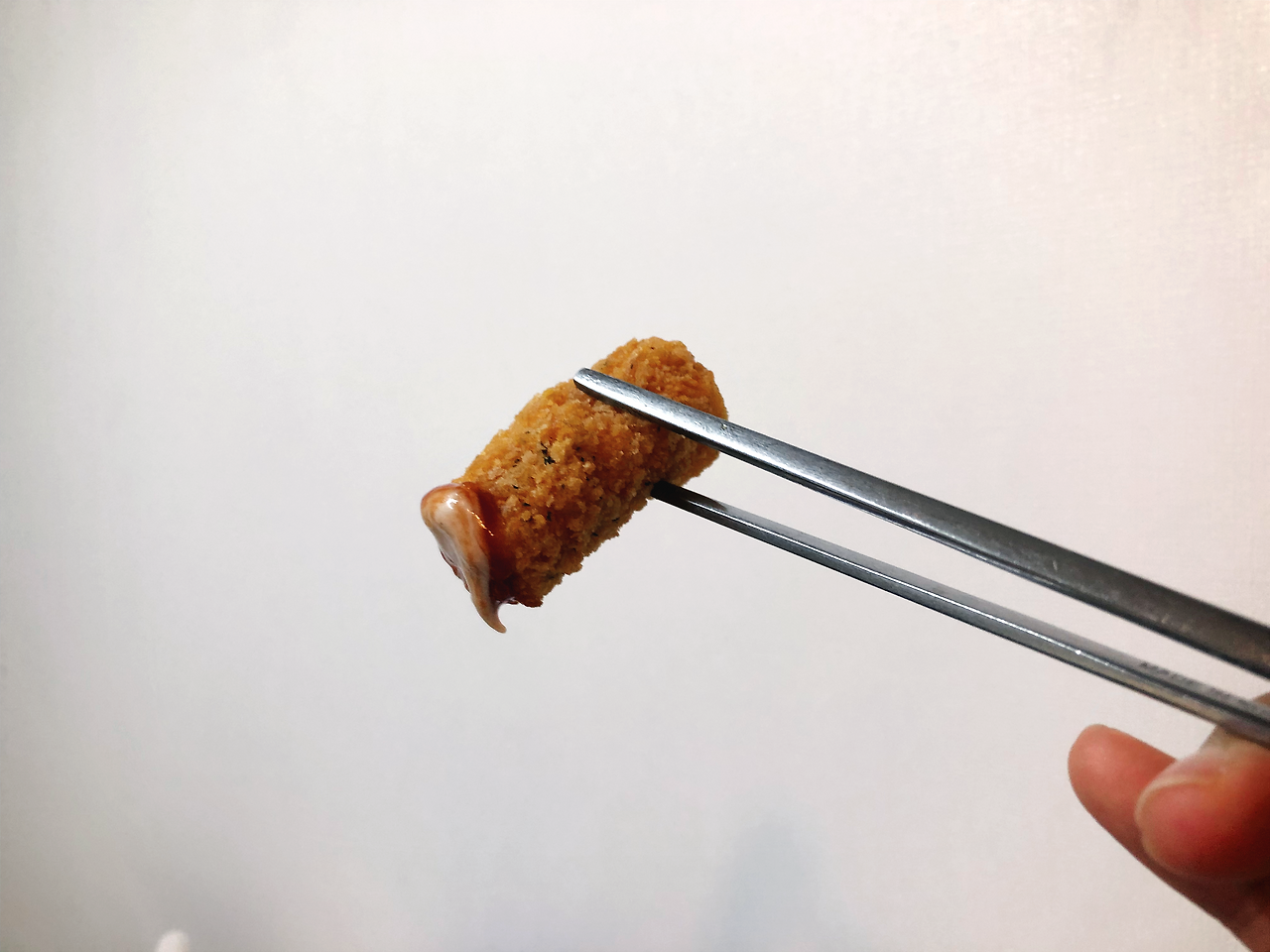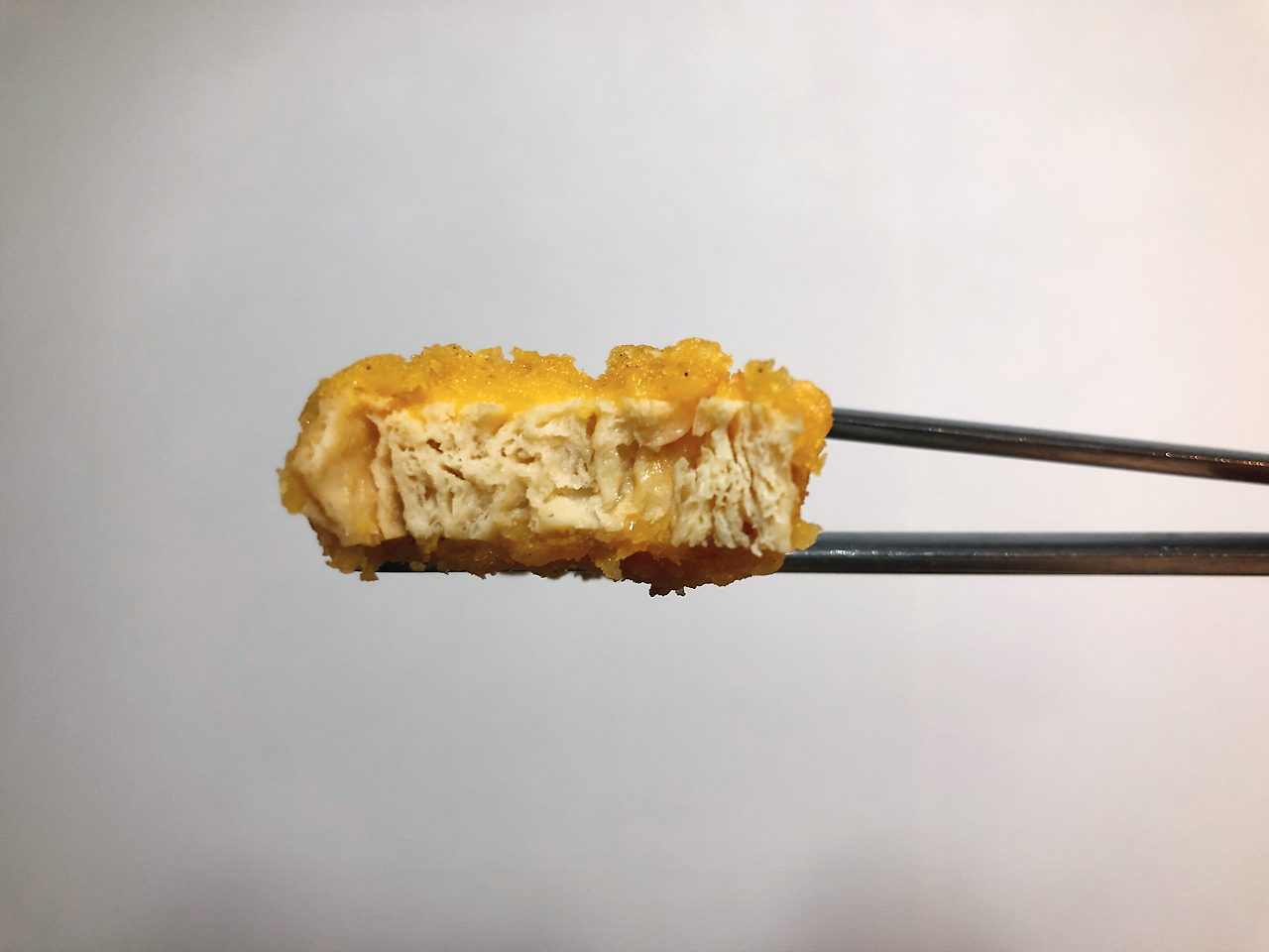 먼저 두부텐더의 단면입니다. 식감을 만들어내기 위해서 결두부를 사용했다고 하는데요, 고기만큼의 조직력이 있진 않지만 두부가 가진 매력을 충분히 나타내며 새로운 카테고리를 만들어 냅니다. 개인적으로는 치킨텐더보다 두부텐더가 더 취향이네요. 케이준시즈닝이 들어가 은은한 매운맛과 짭조름함이 더해져 맛을 끌어올리는 느낌입니다.
