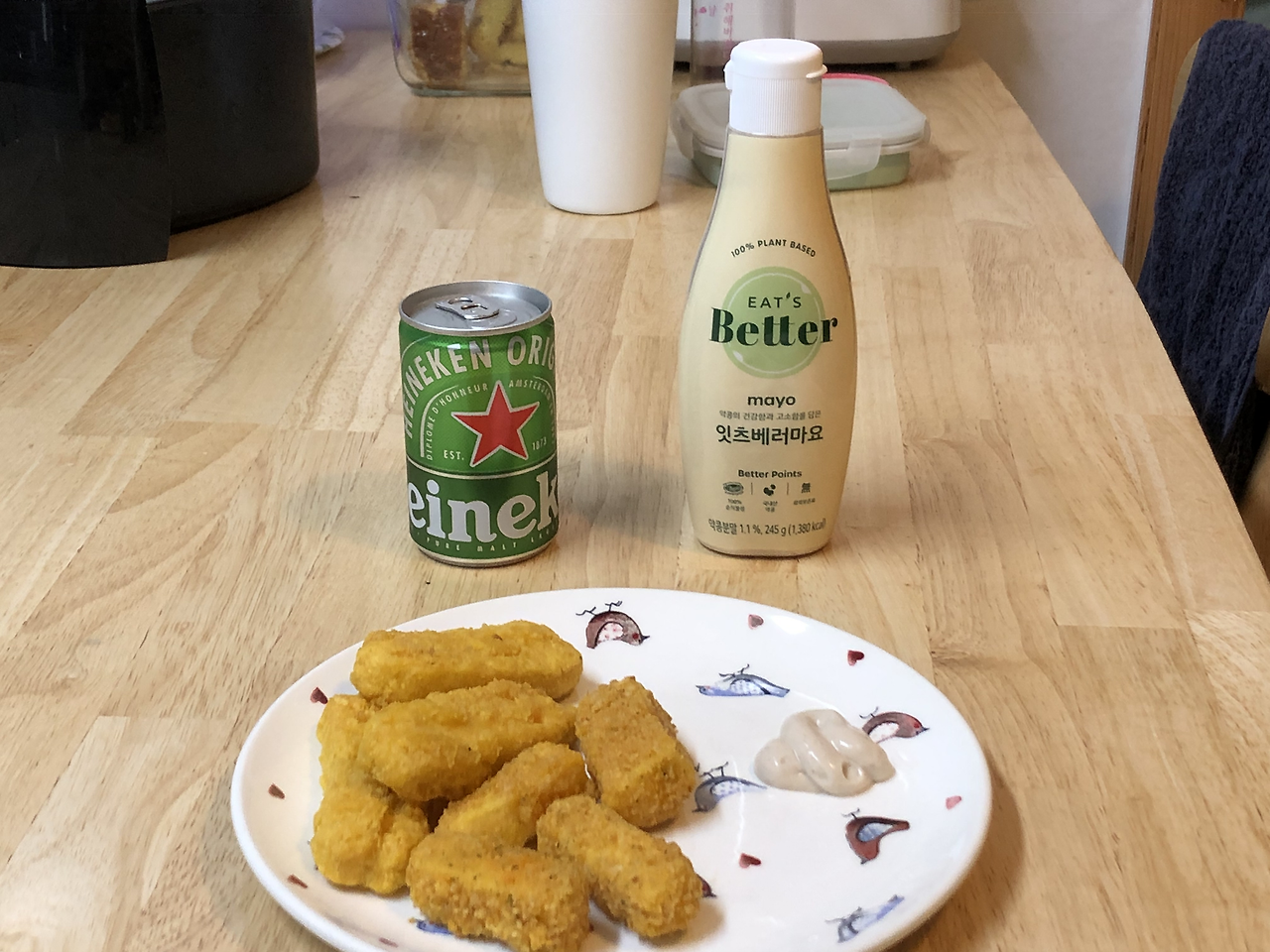 튀김 하면 맥주죠! 하지만 11시가 넘은 시간이라서, 양심상 아주 작은 사이즈의 맥주를 꺼내 들었습니다. 평소에 500ml도 잘 못 먹는 스타일이라 애용하고 있는 사이즈입니다. 그냥 먹어도 맛있지만, 오늘은 작은 길티 플레저로 잇츠베러에서 출시한 소이마요를 곁들여 먹었습니다.