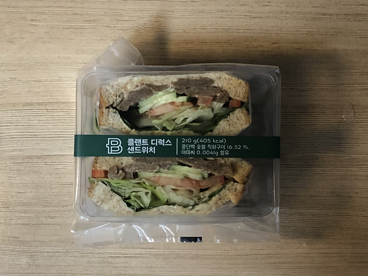다행히 재고가 있었습니다. 그런데.... 솔직히! 다른 제품에 비해 미관상 끌리지 않았습니다. 오색빛의 샌드위치들이 옆에 있는데, 혼자 무채색을 띠고 있는 샌드위치를 선뜻 고르기가 쉽지 않았어요. 완전 채식도 아니다 보니 채식주의자들이 먹을 것 같지도 않고, 그렇다고 논비건들이 옆에 있는 친숙하고 맛도리 넘치게 생긴 일반 샌드위치를 두고 이 제품을 고를 것 같지도 않았습니다. 아마 저처럼 회색지대에 있는 사람들이 먹지 않을까 싶었어요.