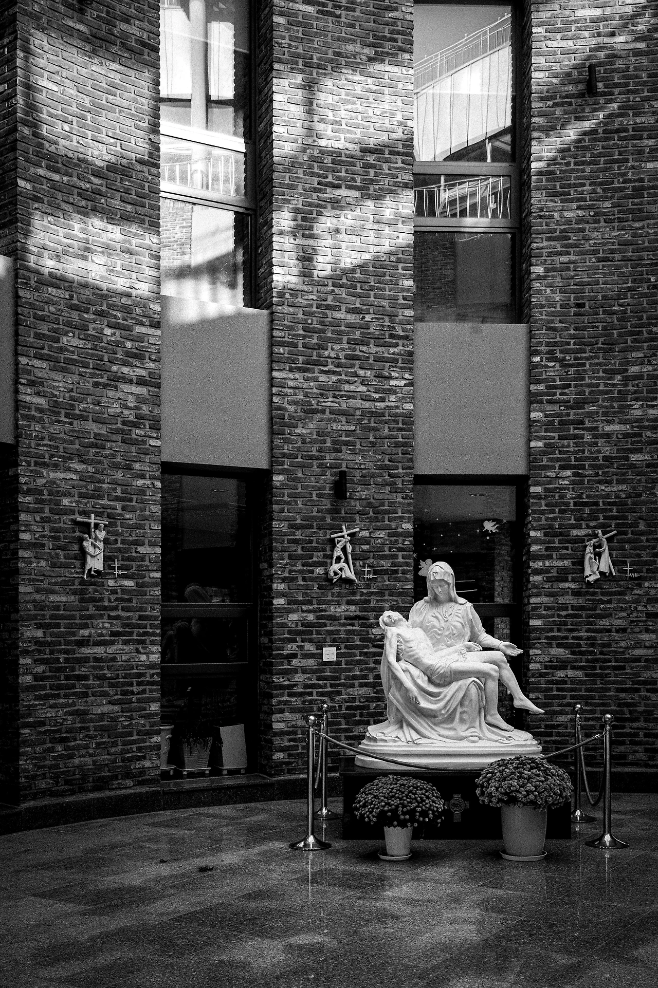 청수 성당의 매력은 입구에 들어서자 느낄 수 있었습니다. 성당 사무실 앞 광장(?)을 원형으로 만들어, 광장에 서면 피에타의 성모( 예수의 죽음을 맞이하는 성모의 슬픔을 뜻합니다)와 십자가의 길(예수가 십자가를 지고 걸어가셨다는 고난의 길)을 볼 수 있습니다. 광장에서 성모님의 슬픔을 돌아 나오면 대성전까지 휘휘 돌아 오르도록 설계되어 있습니다.