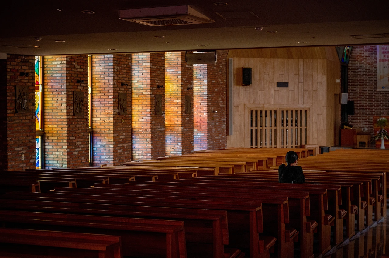 계단을 오를수록 스테인드글라스의 오묘한 빛이 눈을 즐겁게 합니다. 은은한 대성전 내부에는 조용히 기도드리는 여인이 보입니다.