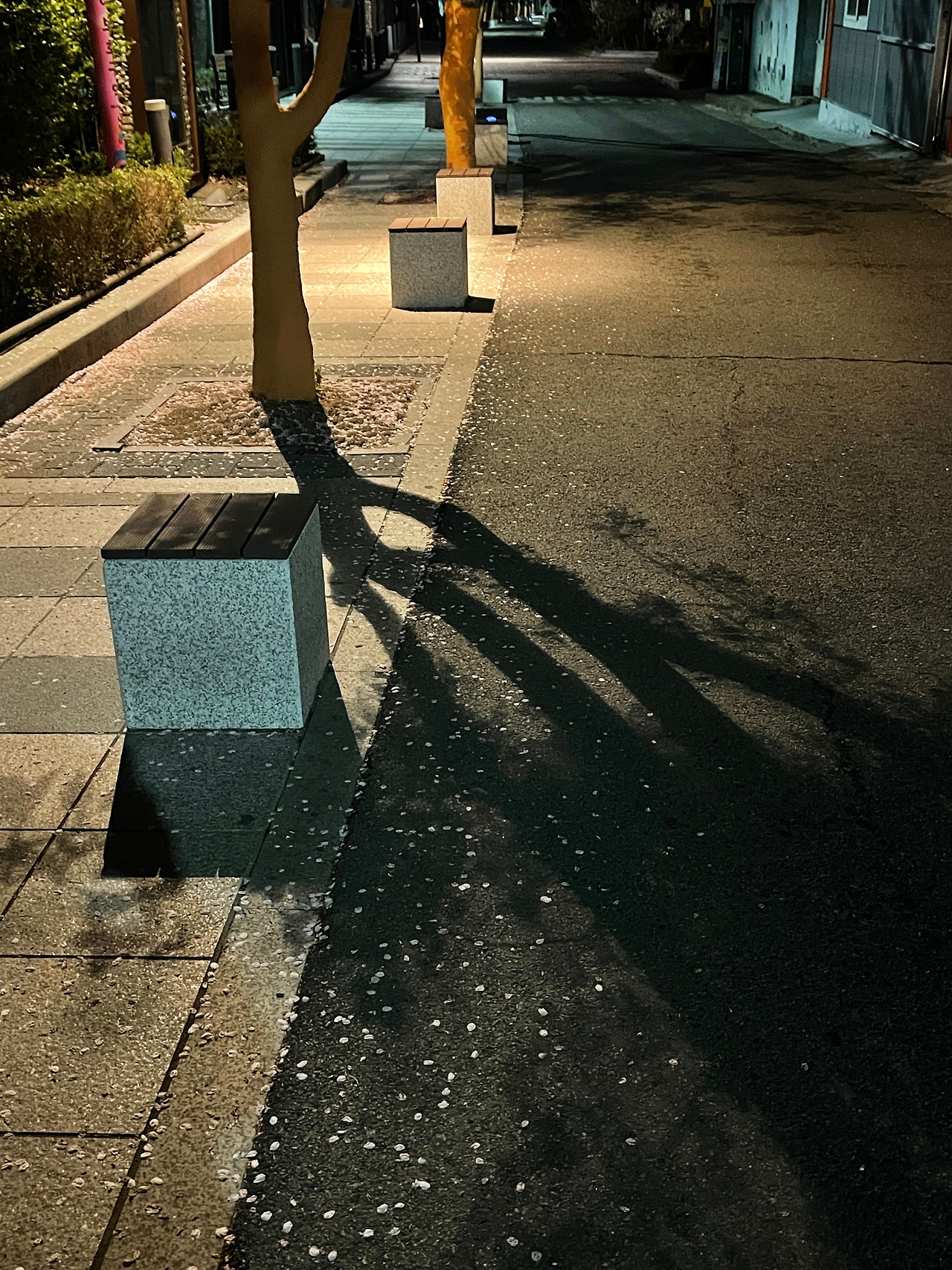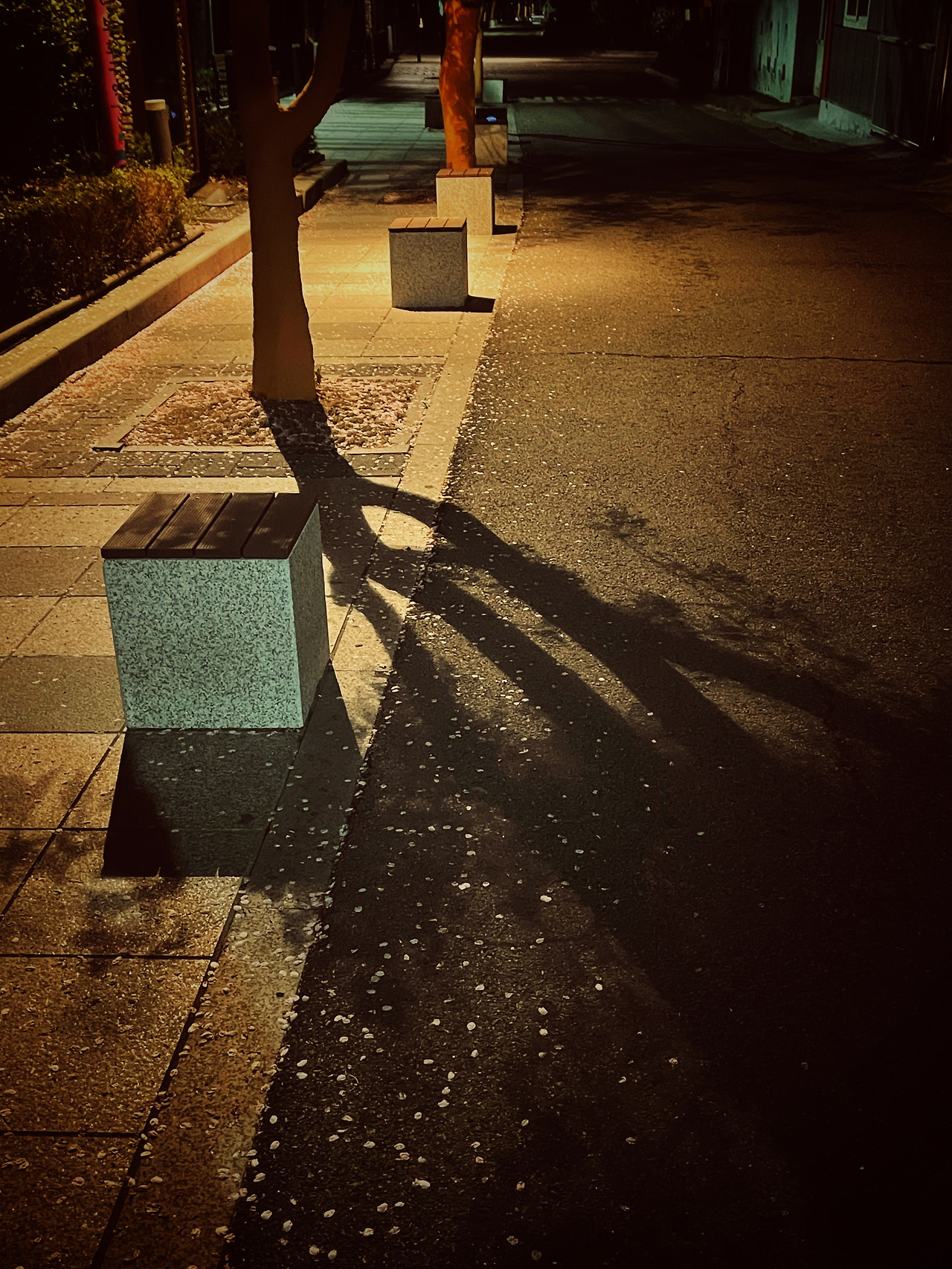 우각로의 빈 공간들을 재빠르게(^^) 벗어나 '창영 철로 갤러리' 길로 들어섭니다. 조명이 거의 없어 촬영할 만한 것들이 보이지 않습니다. 길 끝까지 시선을 돌려보니 거의 끝 지점에 오렌지색 가로등이 보입니다. 왜 오렌지색 가로등인지는 모르겠지만 분위기는 괜찮습니다. 가까이 가보니 가로등에 벚꽃나무가 멋진 그림을 그리고 있습니다. 이렇듯 구도심의 단조로운 조명은 빛을 보는 눈과 흑백사진에 대한 감각을 배우기에 좋습니다. 아이폰 카메라의 '야간모드'를 끄고 촬영을 합니다. 야간모드 성능도 좋지만, 간혹 밤의 느낌을 살리려고 끄고 촬영을 합니다.