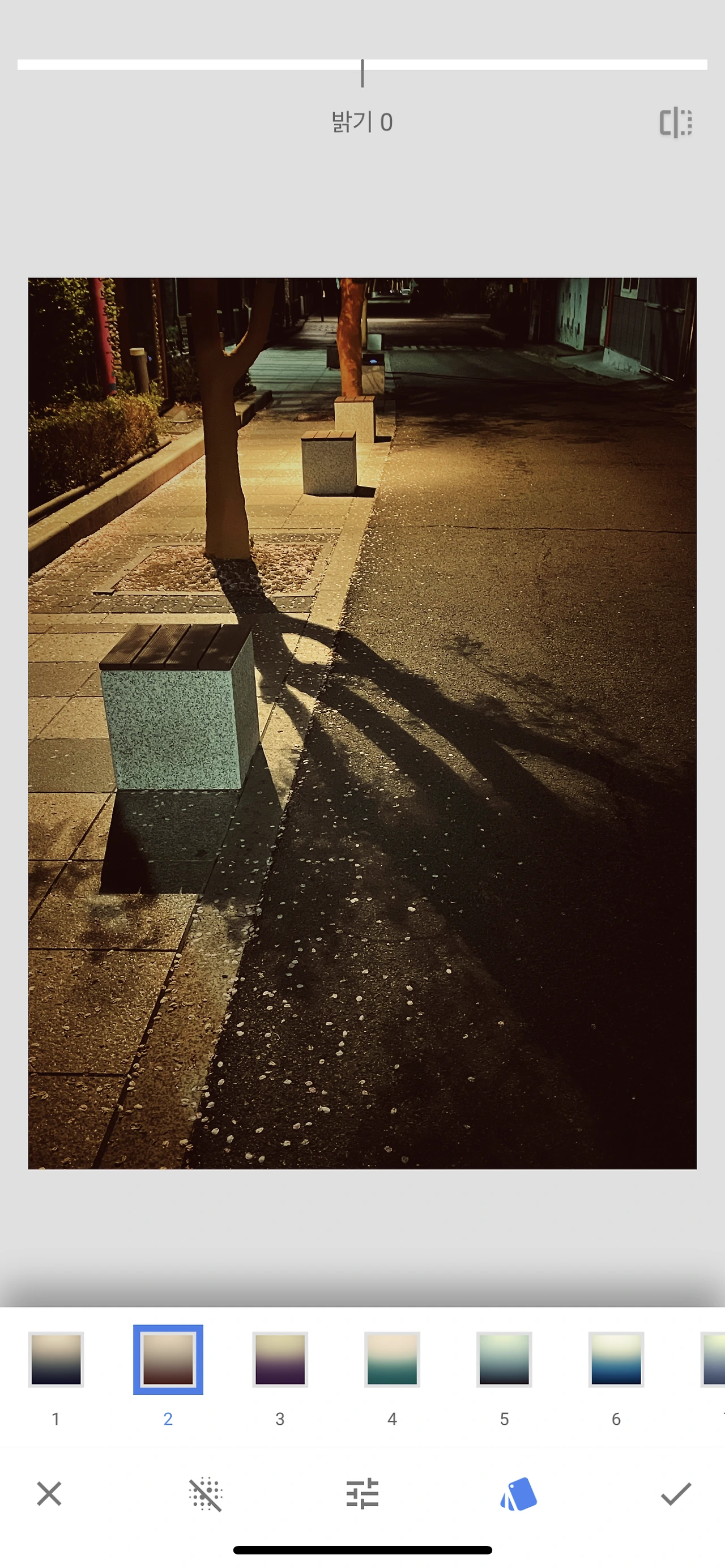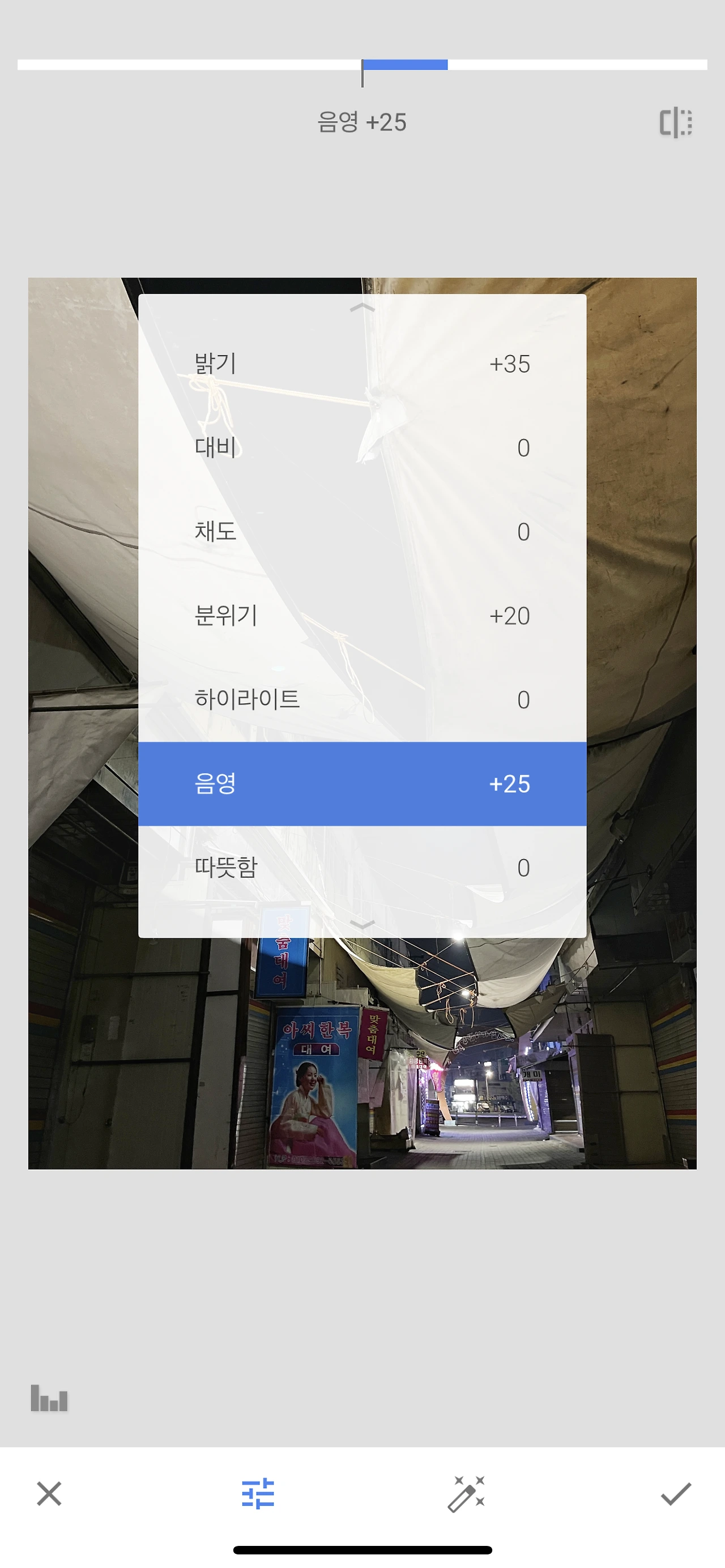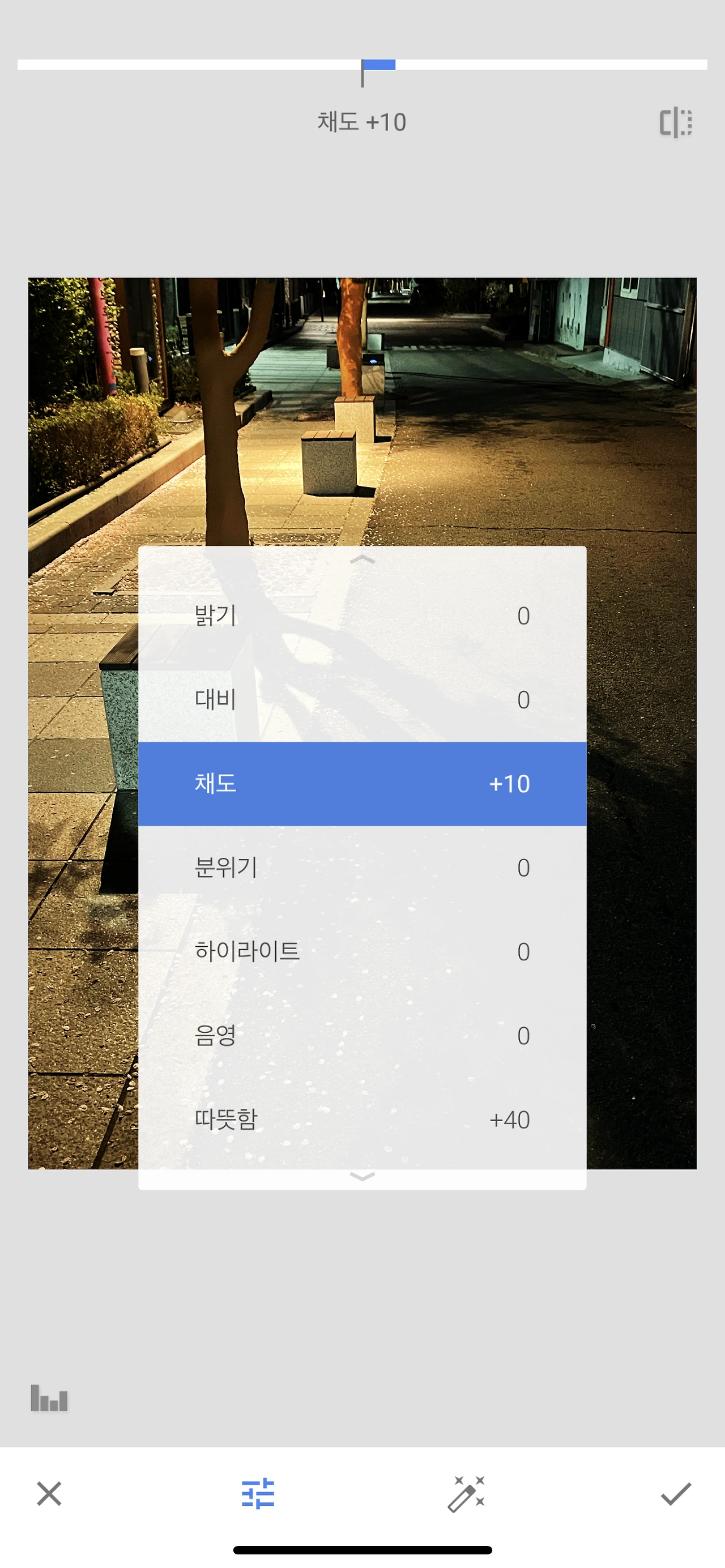 촬영된 사진을 보니 오렌지색 조명의 느낌이 현저하게 떨어집니다. 스냅 시드로 불러와서 기본 보정 메뉴를 엽니다. 채도와 따뜻함을 올려 눈으로 보이는 것과 같은 느낌을 만듭니다. 비네트를 조금 더할까 하다가 빈티지 메뉴에서 오렌지 계열 필터를 선택합니다. 사진을 내보냅니다.