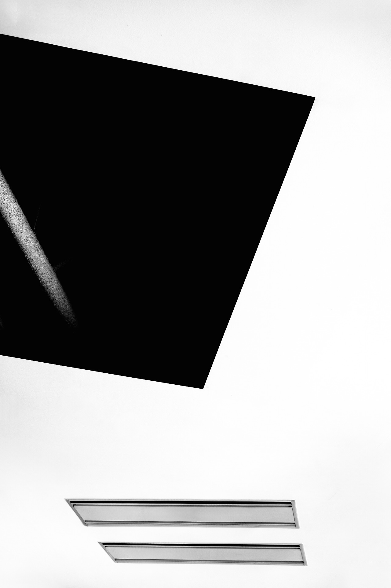 이 사진은 단순한 형태와 강렬한 명암 대비를 통해 미니멀리즘을 표현합니다. 검정색 사각형은 흰 배경 위에서 마치 공간을 가로지르는 창문처럼 보이며, 그 아래의 직사각형들은 그 공간을 지지하는 듯한 느낌을 줍니다. 이러한 기하학적 배치는 단순하면서도 강렬한 시각적 인상을 남기며, 관람자들에게 형태의 본질과 공간의 의미를 탐구하도록 유도합니다.