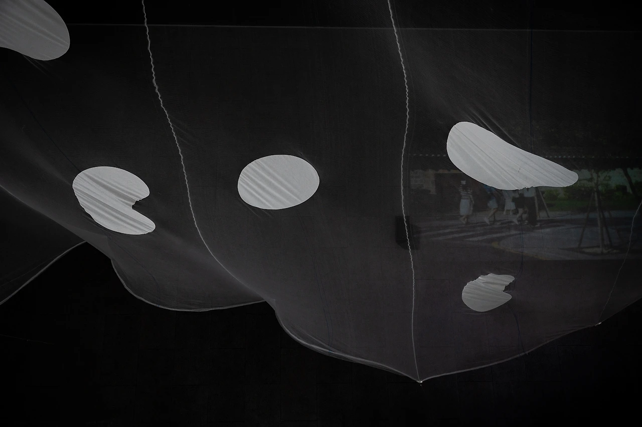 첫 번째는 곡선으로 부드럽게 하늘거리는 천입니다. 사진 속 하늘거리는 천은 우리 삶이 유약함을 상징적으로 보여줍니다. 천이 가볍게 떠 있는 모습은 마치 허공을 부유하는 영혼이 연상됐으며, 천의 반투명한 특성은 생과 사, 물질과 영적 세계 사이의 얇은 경계를 느끼게 했습니다. 여기서 천은 단순한 오브제가 아니라, 우리 삶과 죽음, 그리고 그 사이의 복잡한 관계를 상징한다고 생각합니다.