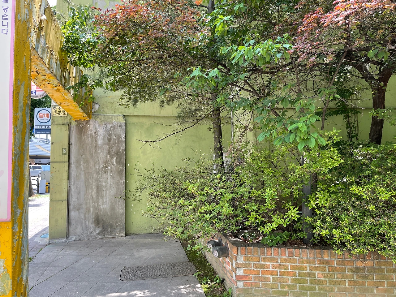 골목을 나와 저번에 촬영했었던 장소들이 생각나서 비교도 할 겸 촬영하려고 합니다. 배다리 헌책방 거리로 가는 교차로를 건너기 전 산부인과 건물로 갑니다. 병원 현관은 여전히 옅은 초록의 벽면과 늘어진 나무들이 반깁니다. 봄날의 나른함과 초록의 기운을 담아보려 고민하다가 촬영한 사진의 원본은 아래와 같습니다. 밋밋한 초록의 잔치를 없애려고 전경에 늘어진 나무에 포커스를 맞춥니다. 전체를 포기하고 부분을 잘라 인물사진 모드(갤럭시도 인물사진 모드)로 뒷 배경을 날립니다.