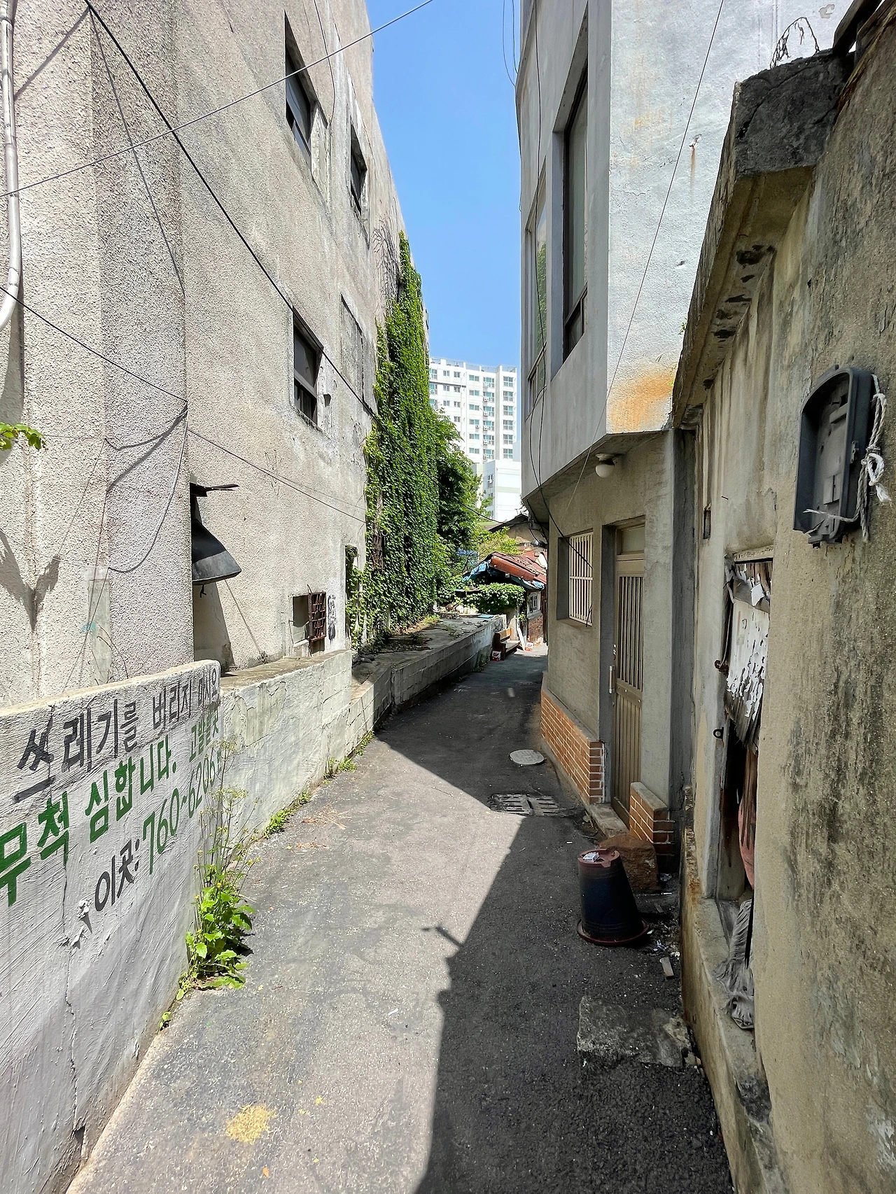 길냥이를 뒤로 하고 골목을 돌아 나와 다른 골목으로 재빠르게 들어갑니다. 좁고 기다란 골목이 보입니다. 그 자체로 괜찮은 곳이라 프레임만 결정하면 됩니다. 빛과 그림자와 뒷배경까지 고려해서 프레임을 결정합니다. 역동감을 주는 대각선이 교차하고 있어서 시선이 소실점으로 집중됩니다. 그림자가 적절한 비율을 차지하도록 프레임을 결정합니다.