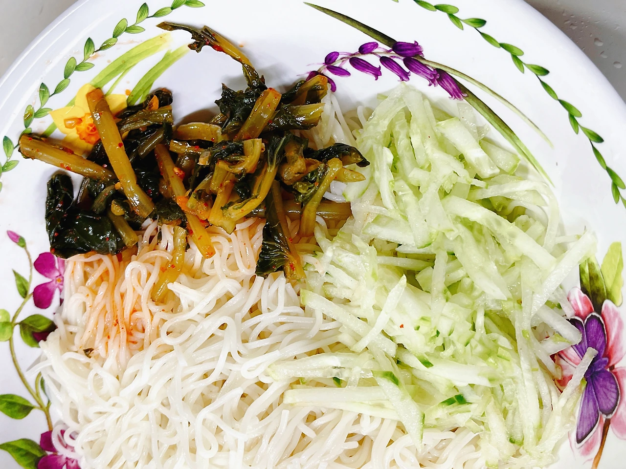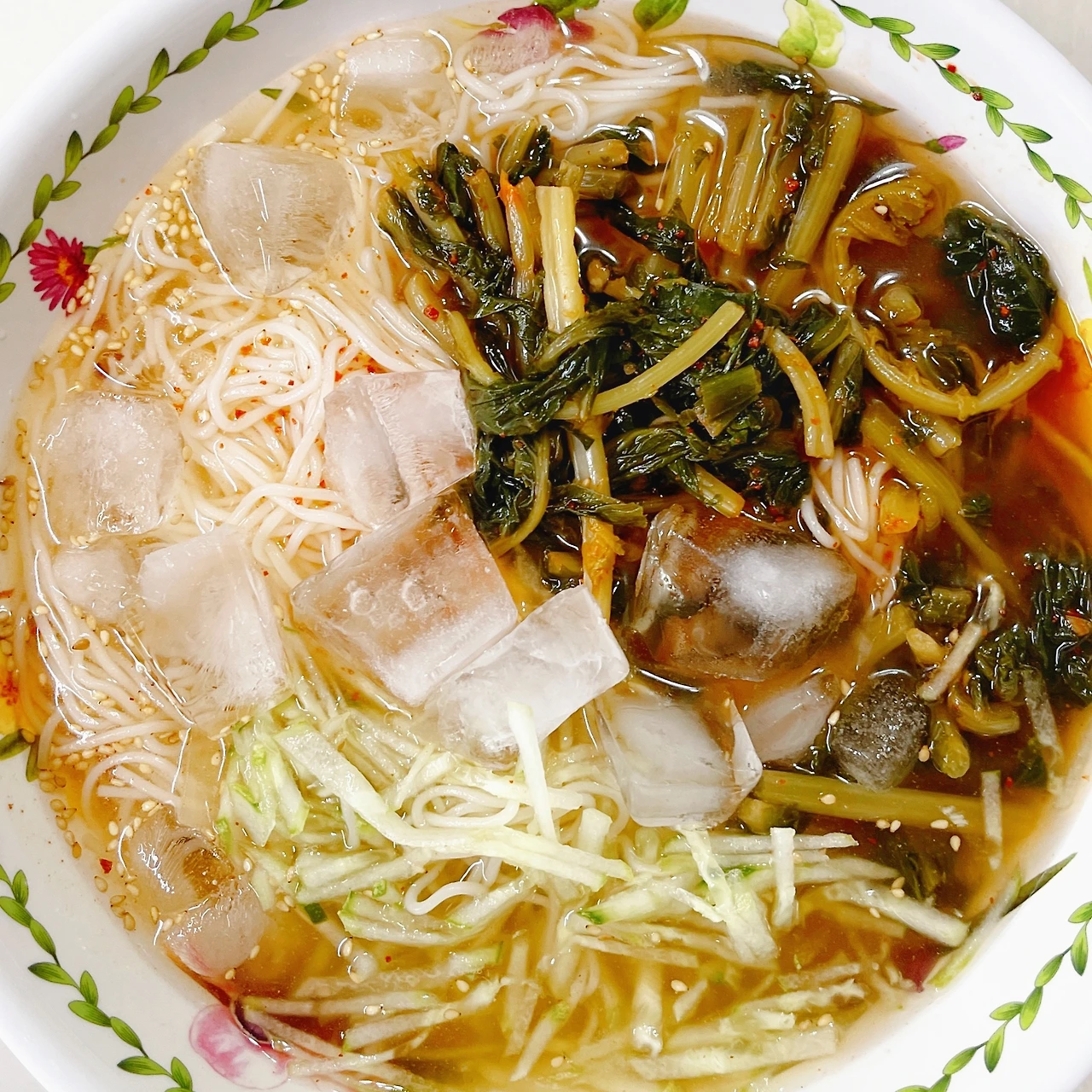 국수, 오이, 열무김치, 동치미 육수(기성품), 참기름, 얼음
