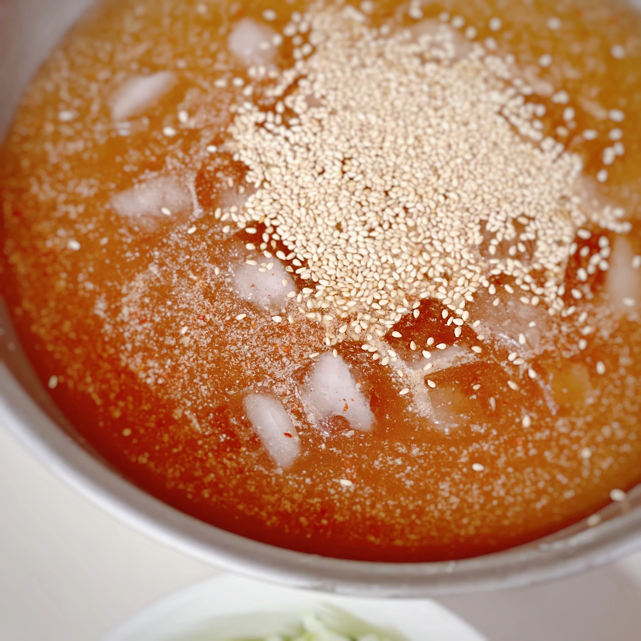 6. 시원한 육수를 붓고 얼음을 더 추가합니다.