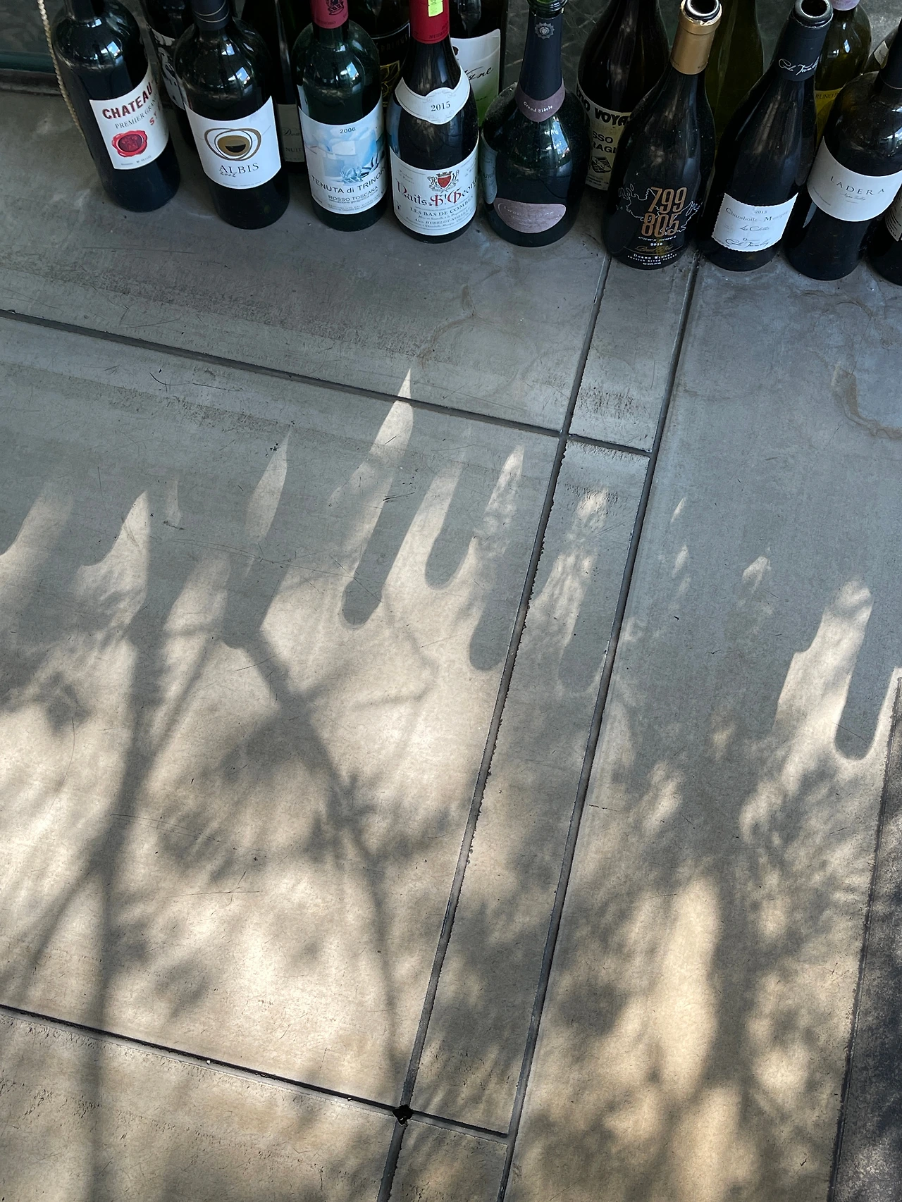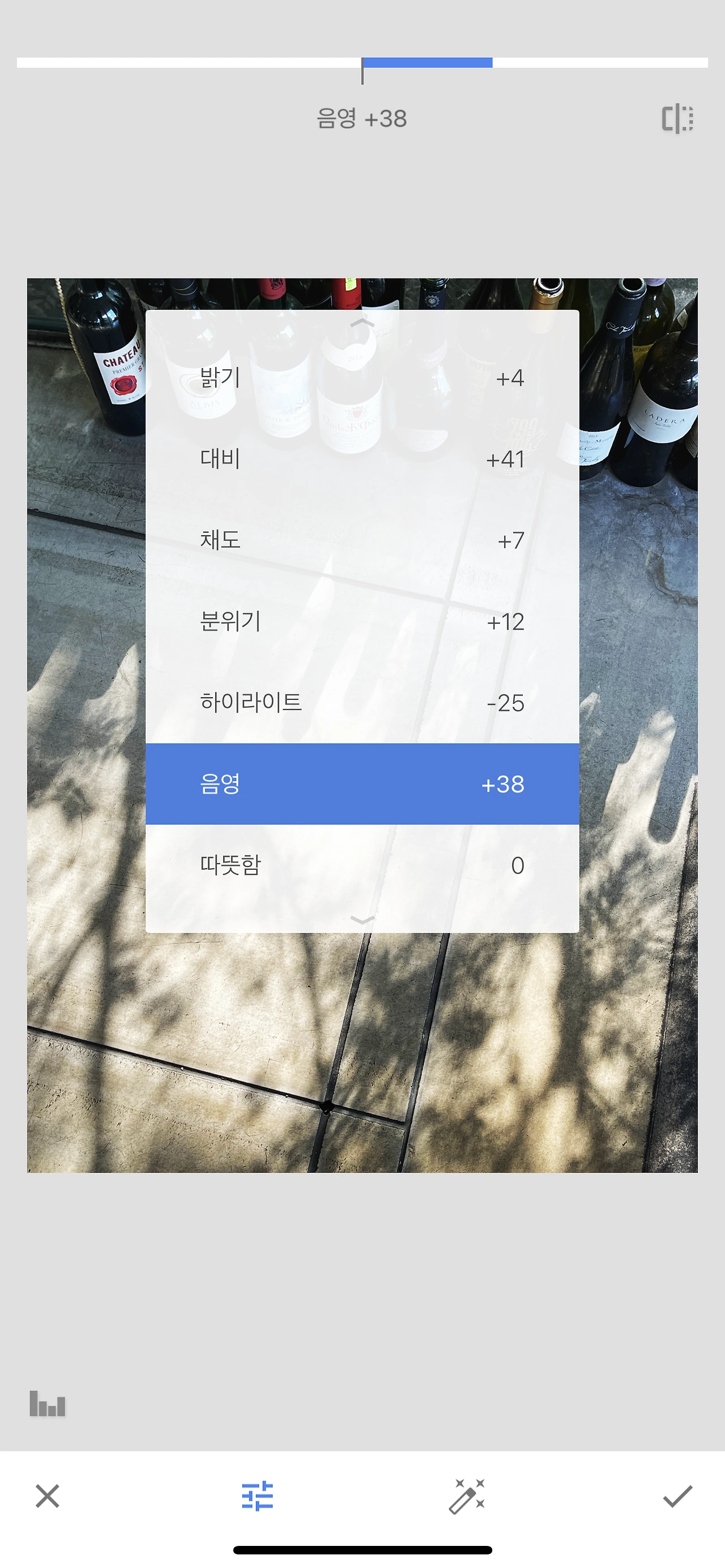 햇살이 강하게 내리쬐는 창틀 아래 질서 없이 늘어진 와인병들이 보입니다. 잠시 관찰하다 빛의 또 다른 이면인 '그림자'를 살리기로 마음먹습니다. 와인병들을 위로 배치하고 바닥의 무늬가 대각선을 이뤄 동감을 나타낼 수 있도록 프레임을 비틉니다. 바깥의 나무 그림자와 와인병 그림자가 조화를 이루도록 구성하고 촬영합니다. 그림자의 명암대비를 살리기 위해 스냅 시드에서 '기본 보정'으로 조절합니다. 대비와 음영을 많이 올려주고, 하이라이트를 낮춰서 그림자를 강하게 만들어줍니다. 제 느낌대로 됐습니다.