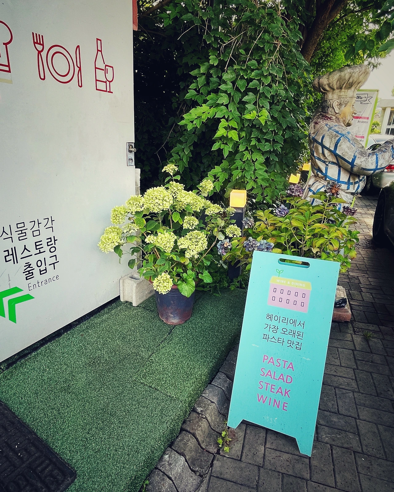 점심식사를 하려고 들린 헤이리의 '식물 감각'이라는 레스토랑입니다. '헤이리에서 가장 오래된 파스타 맛집'이라는 입구 설명에 걸맞게, 건물은 오래되고 낡았습니다. 밤이었다면 감성에 취해 멋있었을 내부와 베란다도 강렬한 햇살로 인해 느낌이 반감됩니다. 2층으로 올라가는 흰색 벽면은 세월의 흔적이 고스란히 남아 있습니다. 여기저기 쌓아져 있는 빈 와인병들이 나름 운치를 더합니다. 자, 이때 일상의 사소한 것들을 예술작품으로 만들기 위한 첫 번째 조건이 나옵니다. 바로 '주의 깊게 관찰하기'입니다.