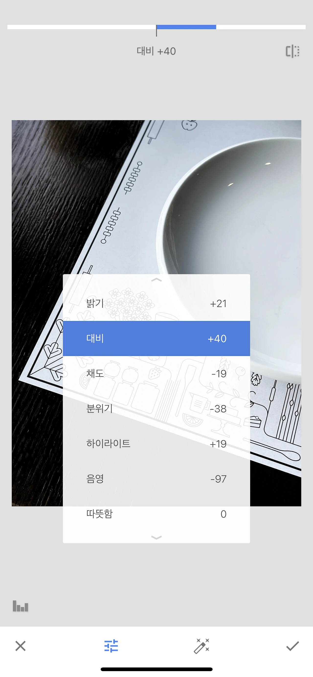 프레임 안에 사각형과 원을 적절한 비율로 배치해서 디자인적 감각을 살립니다. 스냅 시드 '기본 보정'에서 흰색을 더욱 흰색답게 하기 위해 밝기와 하이라이트를 올려줍니다. 대비를 강하게 하기 위해 채도를 빼서 테이블을 검은색에 가깝게 만들어 줍니다. 마찬가지로 대비를 강하게 하기 위해 분위기를 낮춰 디테일한 표현을 포기하고, 대비를 올려주고 음영을 거의 나타나지 않게 낮춰줍니다. 거의 무채색에 가까운 사진이 완성됩니다. 동일 장소에서 동일한 느낌으로 대비를 표현했습니다. 사진 디자인 요소 중에서 가장 많이 볼 수 있는 '대비'입니다.
