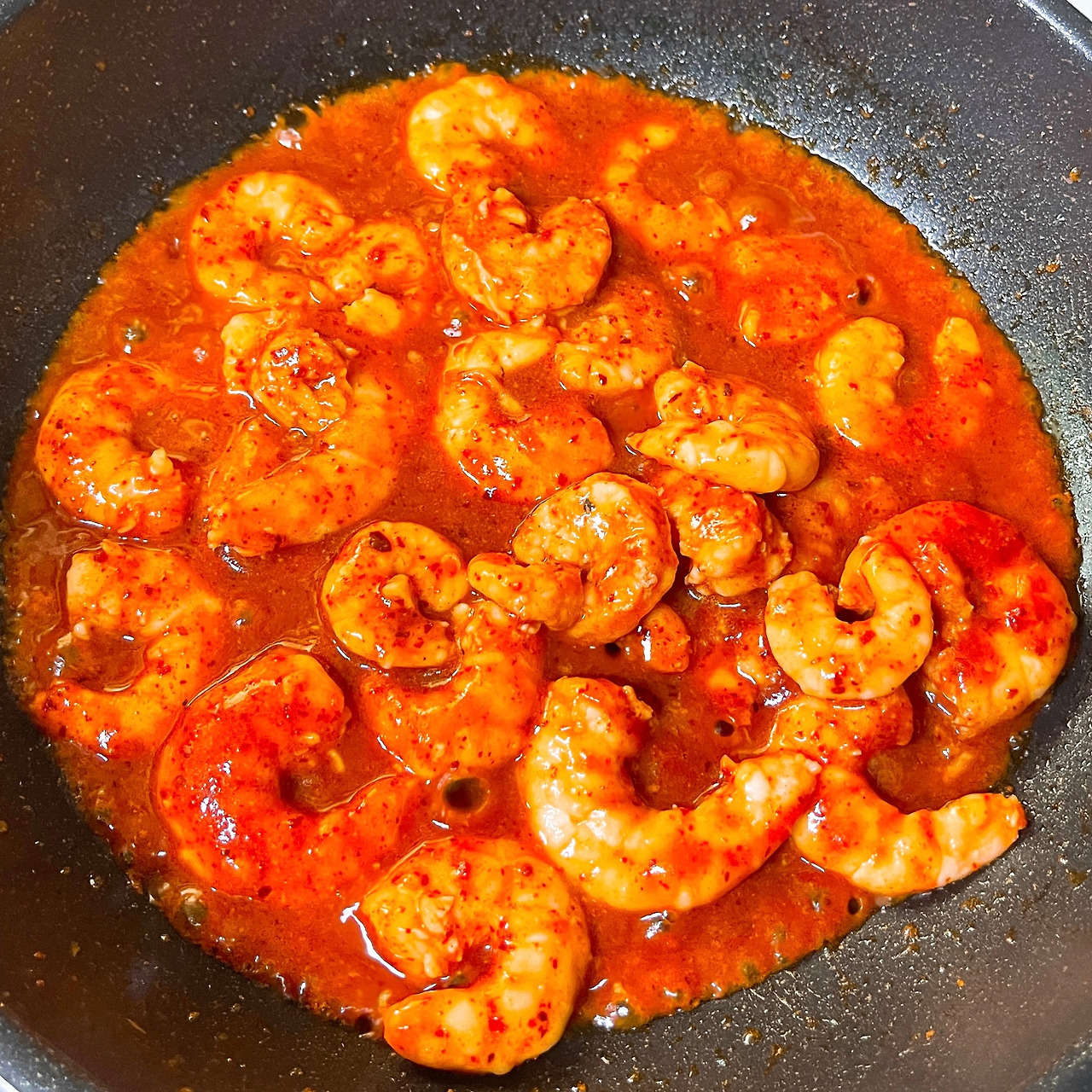4. 새우가 노릇노릇 익으면 케첩 2스푼 반, 간장 1스푼, 고춧가루 1스푼, 설탕 1스푼, 식초 1스푼을 넣어서 골고루 섞어줍니다. (1스푼의 기준은 티스푼이 아니고 새우가 왕새우라서 일반 밥숟가락을 기준으로 했습니다.)