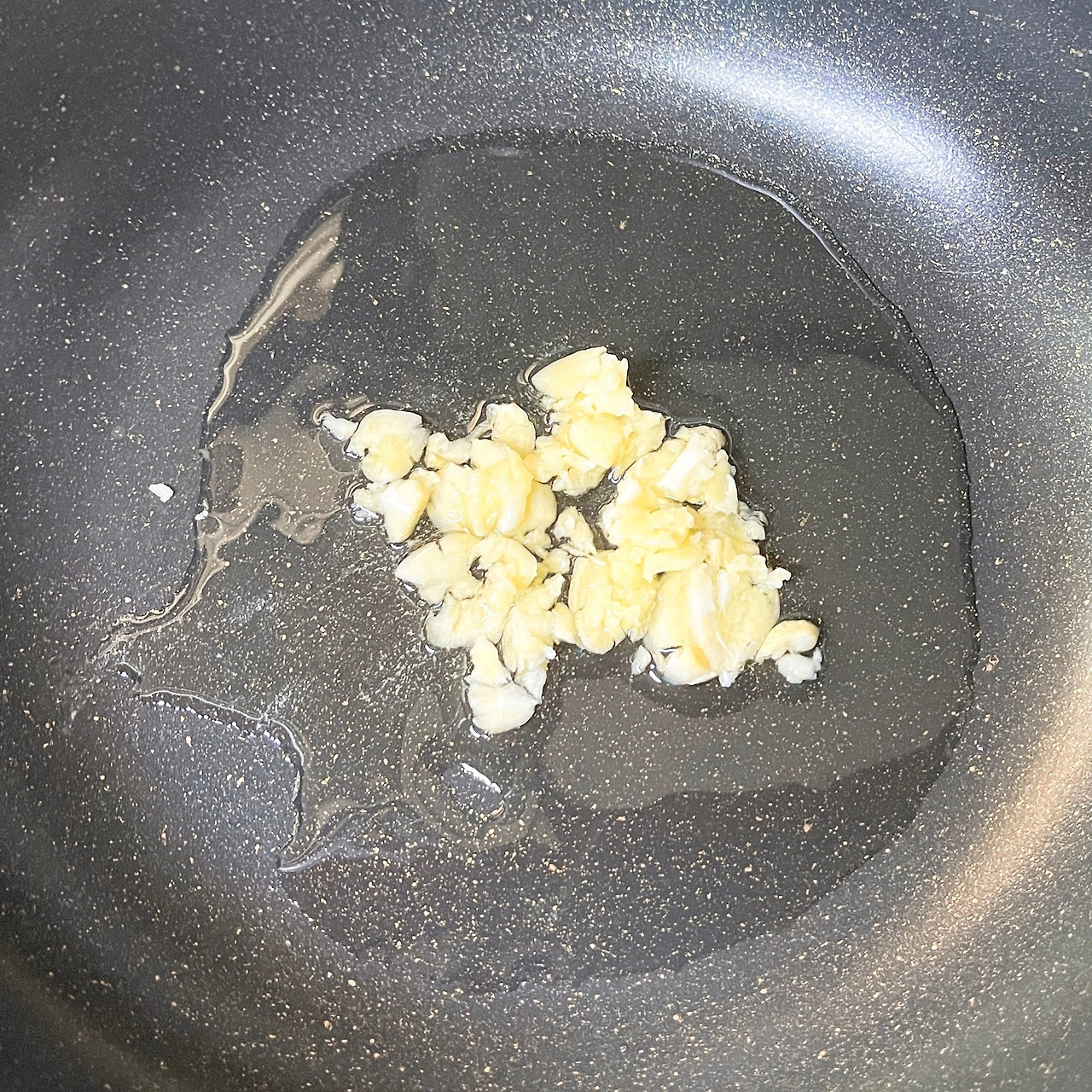 2. 팬에 식용유 2스푼과 마늘 4쪽을 다져서 넣고 센 불에 볶아줍니다.