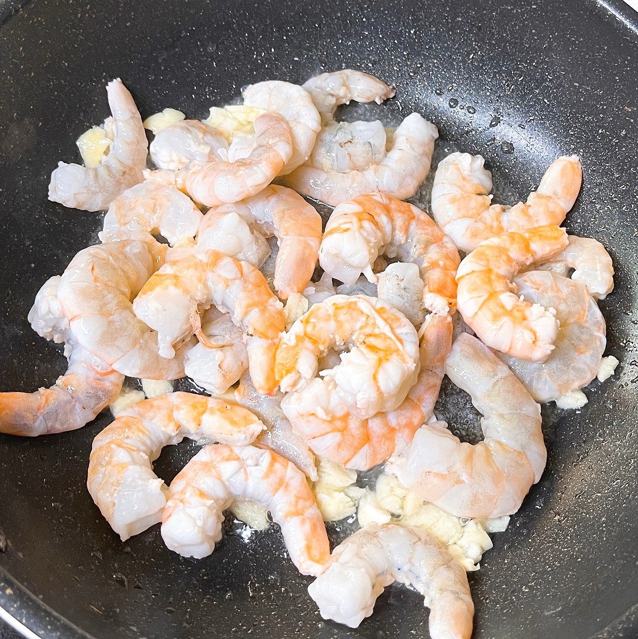 3. 마늘 기름이 향긋하게 올라오면 물기를 뺀 새우를 넣고 잘 익도록 구워줍니다.