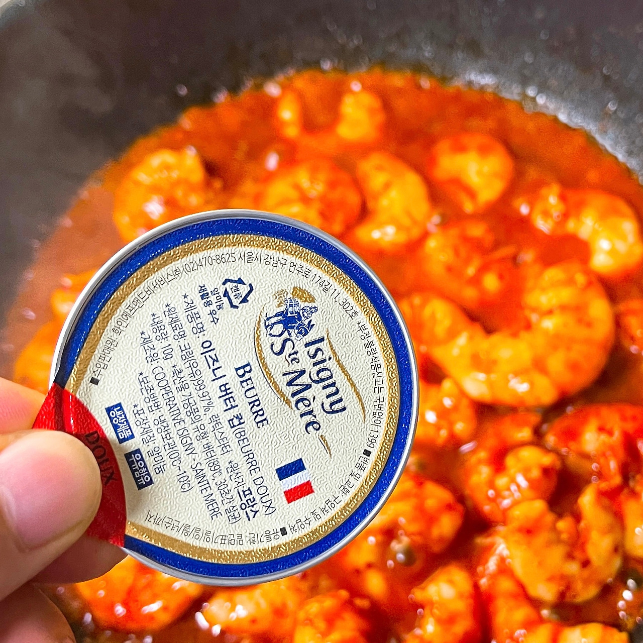 5. 새우에 양념이 잘 스며들었다고 생각이 들면 고소함을 더하기 위해 버터 한 조각을 넣어 줍니다.