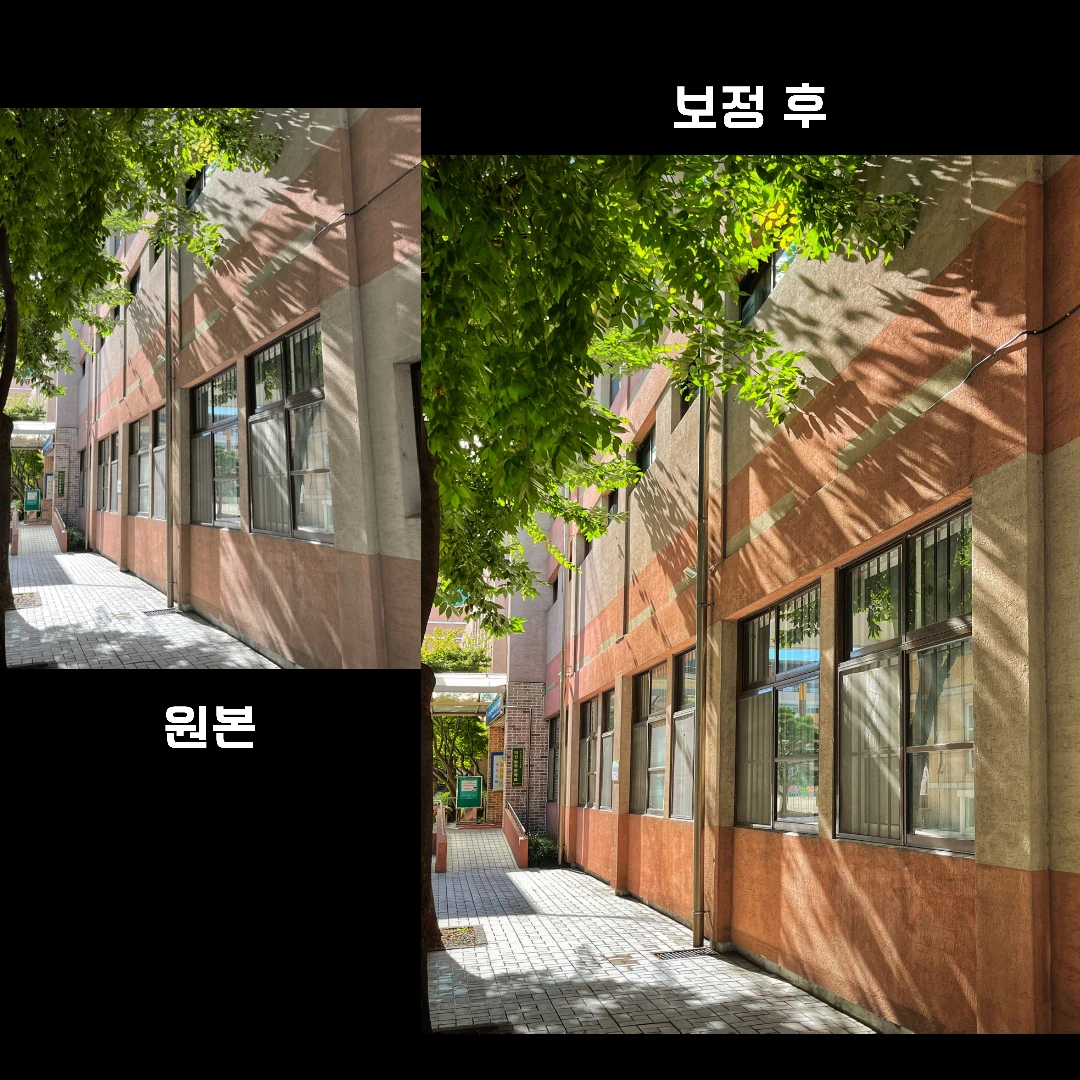 렌즈 왜곡에 의해 건물이 휘어 보이는 부분을 수정합니다. 원근 왜곡 메뉴에서 변화 정도를 살피면서 조정합니다. 마지막으로 비네팅을 주어 시선을 빛이 있는 중심으로 유도합니다. 사진을 사본으로 저장하면 간단하게 끝입니다. 밑에 원본을 첨부했으니까 비교해 보세요.