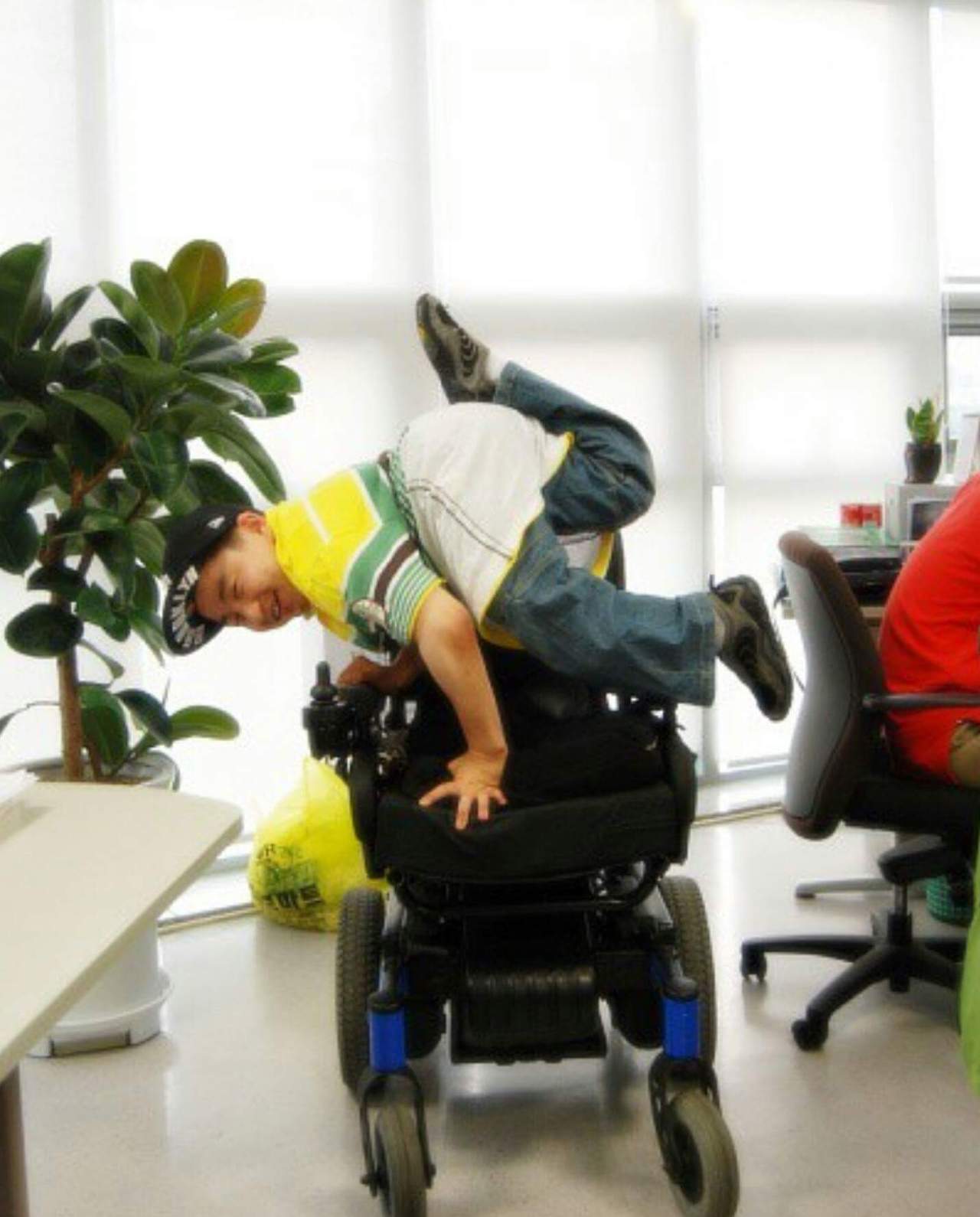 전동휠체어에 앉은 나는 척추 측만으로 늘 무릎꿇고 앉아있어 다리가 있음에도 종종 다리까지 없는 절단 장애인으로 본다.