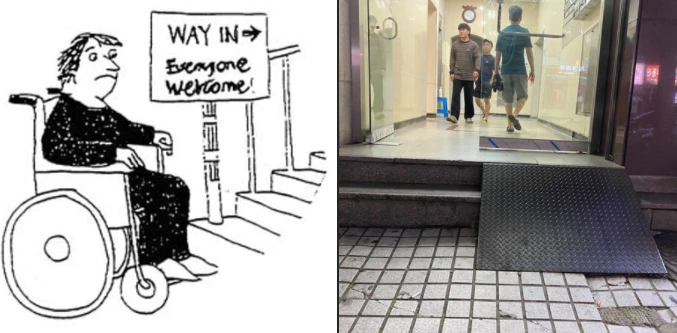 경사로는 누군가의 도움 없이, 독립적인 이동권 보장을 위한 상징과 의지를 보여주지만 사진의 경사로는 이와 반대다. 너무 높고 가파라서 오를 수 없는 계단과 같다.