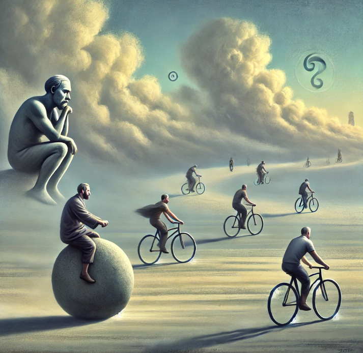 특히 '두발 자전거를 계속 굴려야 하는 모습'이라는 비유가 절묘합니다. 한 번 타기 시작하면 멈출 수 없고, 계속 페달을 밟아야만 하는 현대인의 모습을 너무나 생생하게 포착하셨네요.