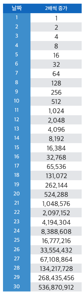 지수 성장하는 것들이 우리를 놀라게 하는 이유는 우리가 선형(linear)으로 사고하는 버릇이 있기 때문이다. 선형으로 성장하는 모습은 시간에 따라 증가하는 양이 일정할 때 나타난다. 마치 돼지 저금통에 매일 천 원씩 집어넣는다고 하면 지금 집어넣는 금액이나 한 달 뒤에 집어넣는 금액, 또는 일 년 뒤에 집어넣는 금액은 똑같이 천 원인 것과 같다. 하지만 은행의 복리 적금과 같이 쌓이는 양에 따라 새로 입금되는 금액이 달라진다면 연못 수련 사례처럼 지수 증가를 하게 된다. 은행 잔액에 따라 7%의 이자가 매년 붙는다고 가정하면 은행 잔액이 두 배가 되는 시점은 11년 뒤가 된다. 즉, 홍길동이 100만 원으로 시작했을 때 처음과 같이 7만 원(100만 원 x 0.07 = 7만 원)의 이자를 매년 받는다면 계좌 잔액이 200만 원이 되는 시점은 15년 째 해가 되지만(100만 원 / 7만 원 = 14.3), 정창권이 매년 은행 잔액 기준으로 7%의 이자를 매년 받는다면 11년 째 해에 두 배가 되는 200만 원을 갖게 된다. 이 대목에서 다음 퀴즈를 맞혀보기 바란다. 위 사례와 같은 조건으로 홍길동과 정창권이 200만 원으로 시작했다고 가정해보자. 각각 두 배가 되는 시점 즉, 400만 원을 갖게 되는 시점은 몇 년 뒤가 되겠는가? 답은 홍길동은 29년 째 해가 되지만 정창권은 여전히 11년 째 해가 된다(주 2).
