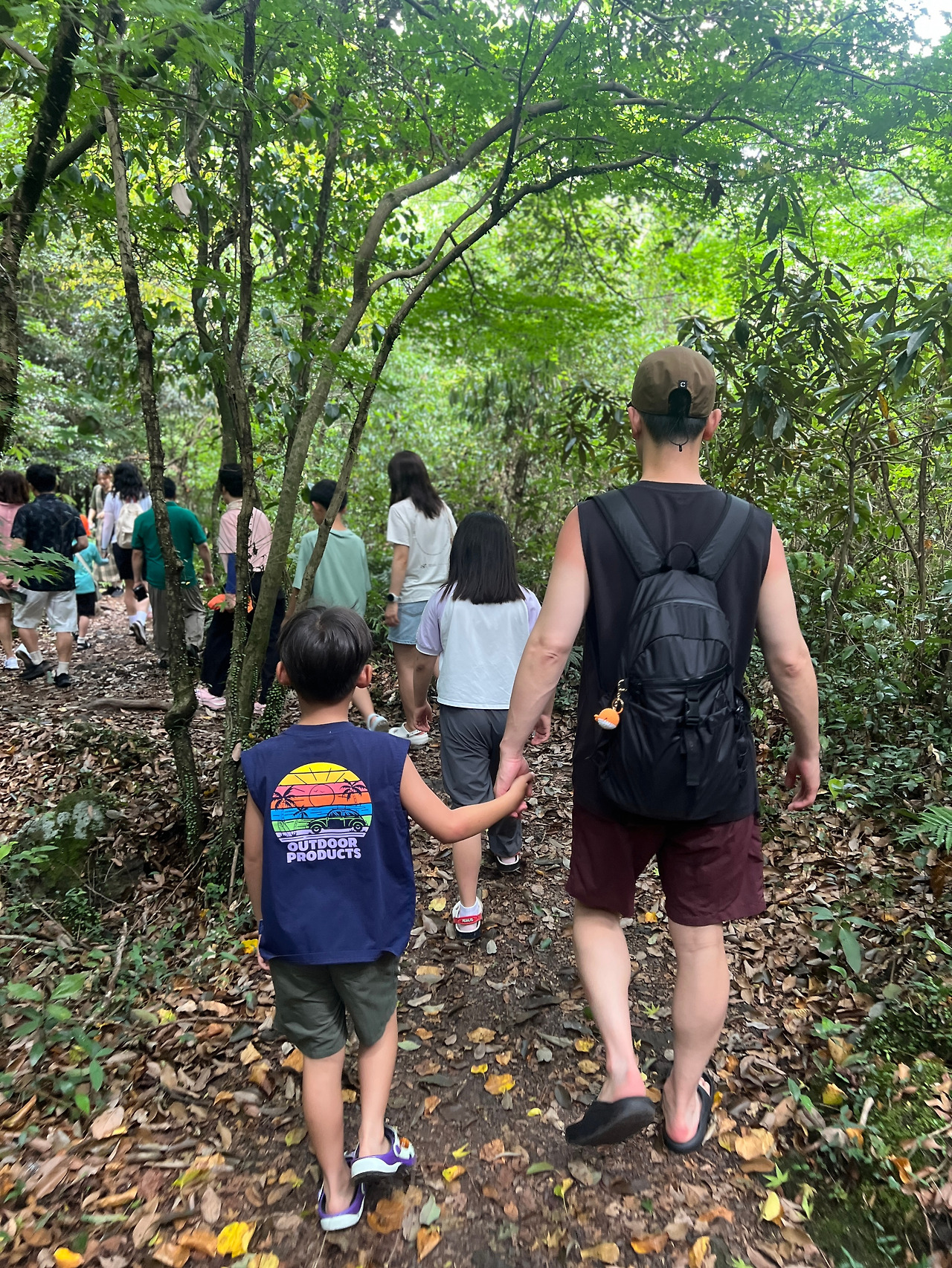 바로 출발하여 도착한 곶자왈 환상숲 정원(이라고 해야 할까?). 곶자왈은 가시나무(자왈) 숲(곶)의 제주도 방언이라고 한다. 제주도의 곶자왈은 화산암 위에서 자라는 나무들로 만들어진 숲이고, 자연적으로 자라난 가시나무가 많아 사람들의 출입이 쉽지 않았다고 한다. 나무가 무성해지면서 햇빛을 받지 못한 가시나무가 고사한 지역들을 위주로 산책로를 만들어, 숲 해설을 하는 코스를 만들어둔 것이다. 지하의 연중 일정한 온도의 공기가 화산암의 틈들을 통해 지상으로 올라와 숲은 여름에는 시원하고 겨울에는 따뜻하여, 사계절 내내 다양한 수종이 자란다고 한다. 지한이도 열심히 숲해설 선생님을 따라 설명을 들었다. 이어 함께 예약한 족욕 체험을 하고 시원한 수박 한 컵을 맛있게 먹은 후 다음 목적지로 향했다.