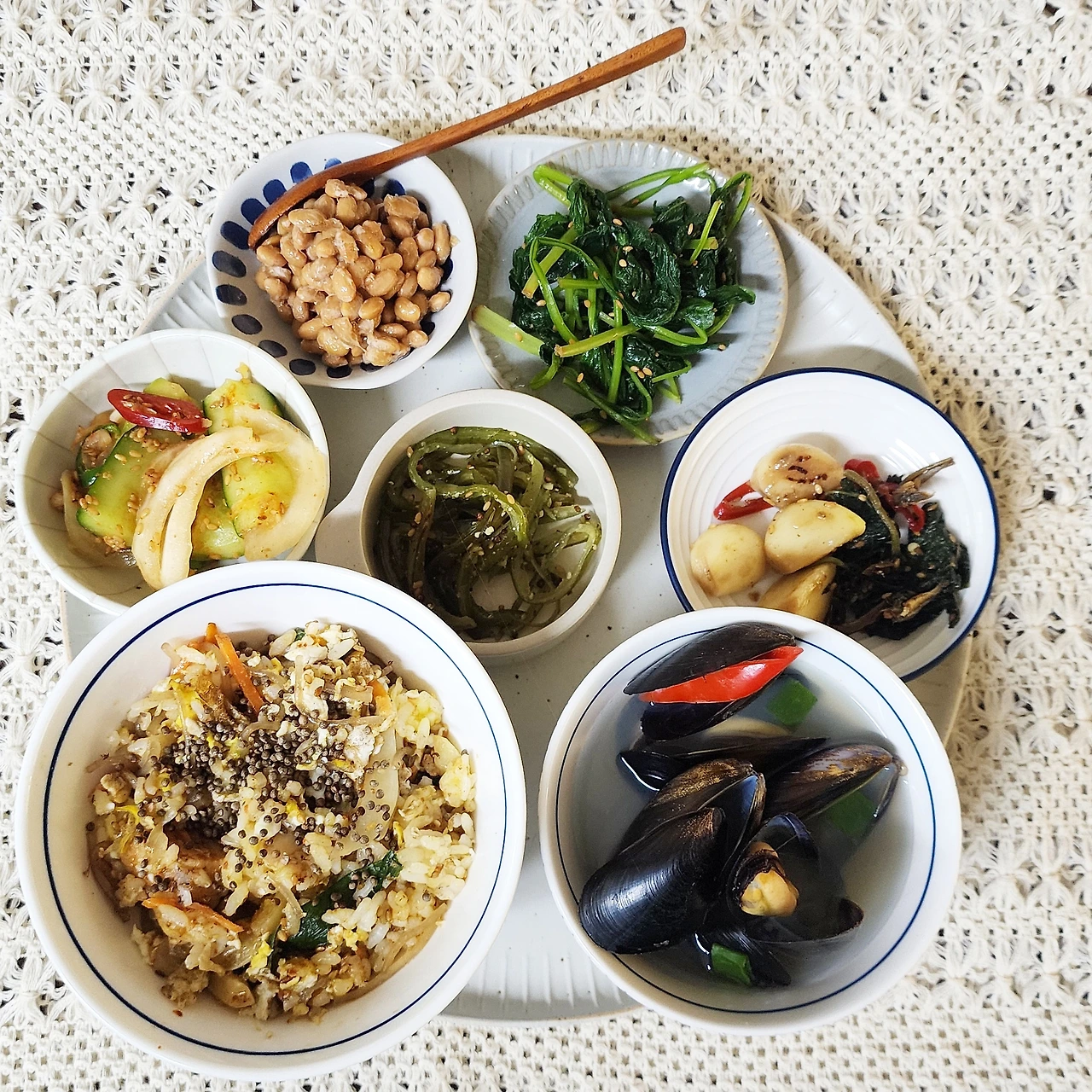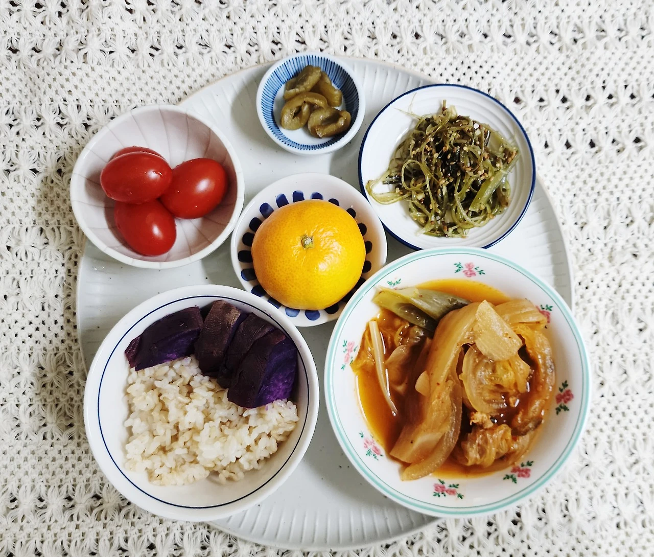 간이 되어있지 않은 야채(브로콜리, 방울토마토, 파프리카등)- (간이 약한 ) 나물- 낫또와 단백질(계란, 두부, 생선, 고기등) - 고구마 - 현미밥